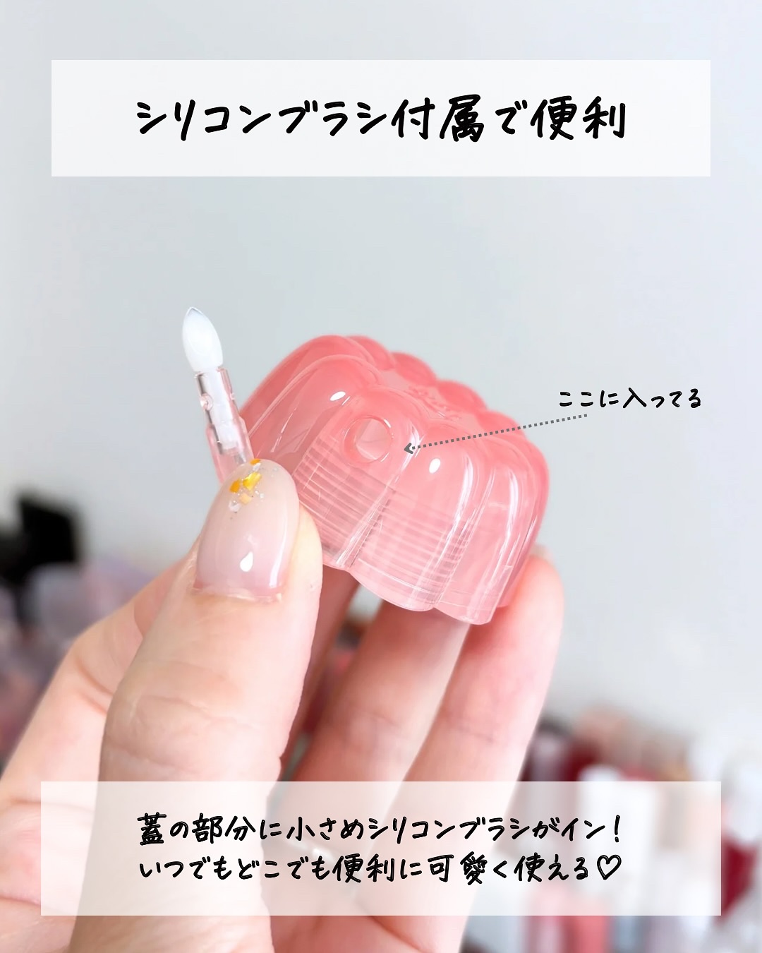 - プリンのような新感覚のチューイングテクスチャーに澄んだカラー感が加わったリップ&チーク。 ぷるぷるとしたゼリーのようなツヤ感が唇と頬にほのかに染まるウォーターリーグロウリップ&チーク。 甘いプリンのようにぷるぷるとした新感覚のチューイングテクスチャーで、べたつかず、なめらかに密着し唇にしっとりとした保湿感を与えます。 イエベ、ブルベの自分の肌トーンごとに使いやすい20色の多彩なカラーバリエーション、透明感のある澄んだカラーと鮮やかな発色、重ね塗りすればするほどあふれ出す、ほのかな水光リップへ導きます。 可愛いプリンのようなラブリーなパッケージで持ち運びが簡単!パッケージの中にはミニブラシが付いていて、衛生的に使えます。 ※ふんわりとしたゼリーテクスチャーの特徴により、固まりが生じることがありますので、薄くレイヤーを重ねて十分に塗り伸ばしてください。