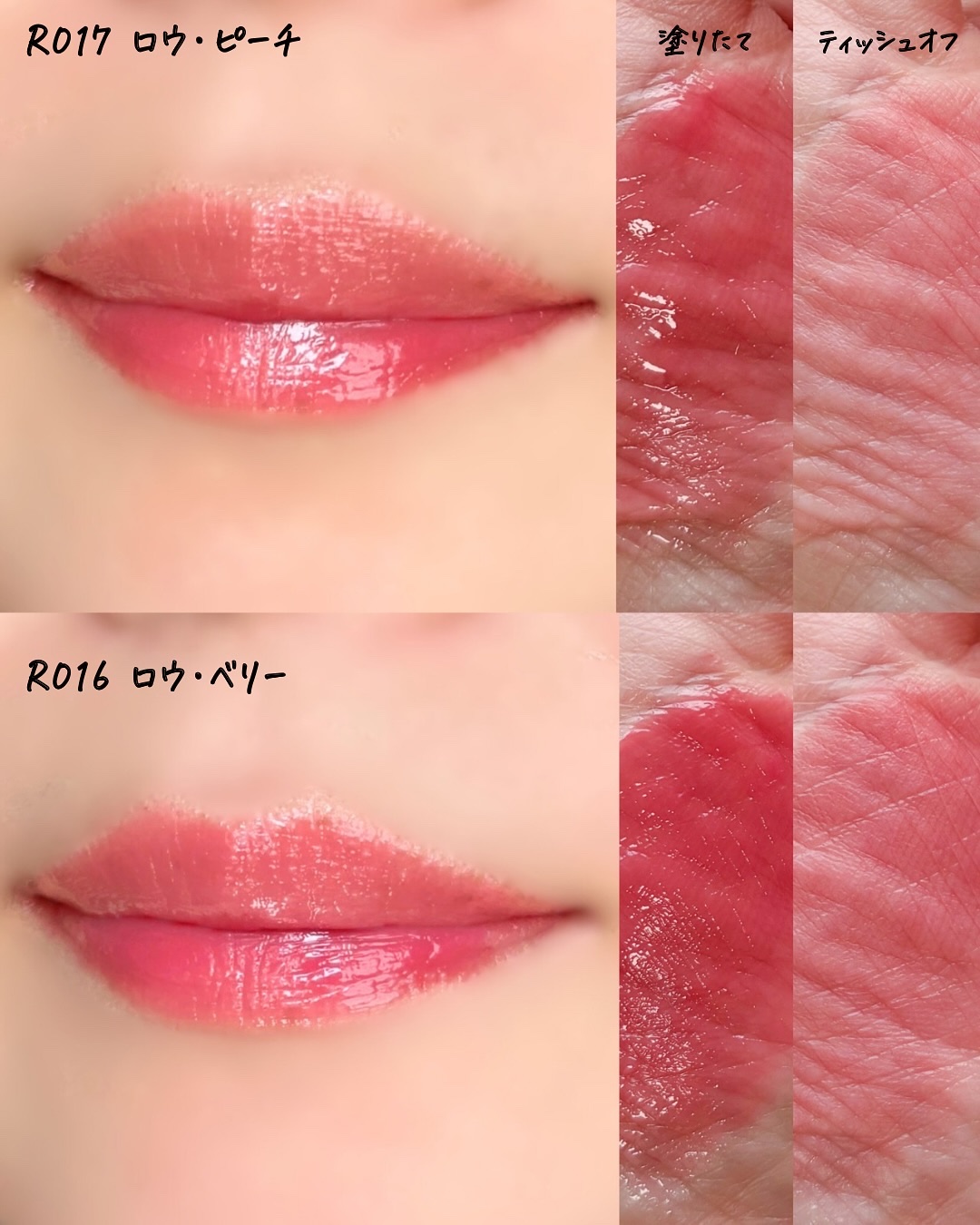 - <R001 ベア> 水、ジフェニルジメチコン、オクチルドデカノール、ビスジグリセリルポリアシルアジペート-2、リンゴ酸ジイソステアリル、トリメチルシロキシフェニルジメチコン、水添ポリイソブテン、ジグリセリン、ポリソルベート60、BG、セチルPEG/PPG-10/1ジメチコン、1,2-ヘキサンジオール、ペンチレングリコール、(アクリル酸ヒドロキシエチル/アクリロイルジメチルタウリンNa)コポリマー、セテアレス-20、スクワラン、フェノキシエタノール、酸化チタン、香料、エチルヘキシルグリセリン、黄5、赤227、イソステアリン酸ソルビタン、水酸化Al、ポリアクリル酸アンモニウム、酢酸トコフェロール、黄4、青1、ヒアルロン酸Na、(アルギニン/リシン)ポリペプチド、加水分解ヒアルロン酸、トコフェロール、アセチルヒアルロン酸Na、ソルビン酸 <R002 ロウローズ> 水、ジフェニルジメチコン、オクチルドデカノール、ビスジグリセリルポリアシルアジペート-2、リンゴ酸ジイソステアリル、トリメチルシロキシフェニルジメチコン、水添ポリイソブテン、ジグリセリン、ポリソルベート60、BG、セチルPEG/PPG-10/1ジメチコン、1,2-ヘキサンジオール、ペンチレングリコール、(アクリル酸ヒドロキシエチル/アクリロイルジメチルタウリンNa)コポリマー、セテアレス-20、スクワラン、フェノキシエタノール、酸化チタン、香料、エチルヘキシルグリセリン、黄5、赤227、イソステアリン酸ソルビタン、酢酸トコフェロール、水酸化Al、ポリアクリル酸アンモニウム、ヒアルロン酸Na、青1、加水分解ヒアルロン酸、(アルギニン/リシン)ポリペプチド、トコフェロール、アセチルヒアルロン酸Na、ソルビン酸 <R003 ロウプリコット> 水、ジフェニルジメチコン、オクチルドデカノール、ビスジグリセリルポリアシルアジペート-2、リンゴ酸ジイソステアリル、トリメチルシロキシフェニルジメチコン、水添ポリイソブテン、ジグリセリン、ポリソルベート60、BG、セチルPEG/PPG-10/1ジメチコン、1,2-ヘキサンジオール、ペンチレングリコール、(アクリル酸ヒドロキシエチル/アクリロイルジメチルタウリンNa)コポリマー、セテアレス-20、スクワラン、フェノキシエタノール、香料、エチルヘキシルグリセリン、酸化チタン、黄5、イソステアリン酸ソルビタン、赤227、酢酸トコフェロール、ヒアルロン酸Na、水酸化Al、ポリアクリル酸アンモニウム、加水分解ヒアルロン酸、青1、(アルギニン/リシン)ポリペプチド、トコフェロール、アセチルヒアルロン酸Na、ソルビン酸 <R004 フィーバー> 水、ジフェニルジメチコン、オクチルドデカノール、リンゴ酸ジイソステアリル、ビスジグリセリルポリアシルアジペート-2、トリメチルシロキシフェニルジメチコン、水添ポリイソブテン、ジグリセリン、ポリソルベート60、BG、セチルPEG/PPG-10/1ジメチコン、1,2-ヘキサンジオール、ペンチレングリコール、(アクリル酸ヒドロキシエチル/アクリロイルジメチルタウリンNa)コポリマー、セテアレス-20、スクワラン、フェノキシエタノール、香料、エチルヘキシルグリセリン、黄5、赤227、イソステアリン酸ソルビタン、酢酸トコフェロール、ヒアルロン酸Na、加水分解ヒアルロン酸、(アルギニン/リシン)ポリペプチド、トコフェロール、アセチルヒアルロン酸Na、ソルビン酸 <R005 ハイビスカス> 水、ジフェニルジメチコン、オクチルドデカノール、ビスジグリセリルポリアシルアジペート-2、リンゴ酸ジイソステアリル、トリメチルシロキシフェニルジメチコン、水添ポリイソブテン、ジグリセリン、ポリソルベート60、BG、セチルPEG/PPG-10/1ジメチコン、1,2-ヘキサンジオール、ペンチレングリコール、アクリル酸ヒドロキシエチル/アクリロイルジメチルタウリンNa)コポリマー、セテアレス-20、スクワラン、フェノキシエタノール、香料、エチルヘキシルグリセリン、赤227、黄5、イソステアリン酸ソルビタン、赤104(1)、酢酸トコフェロール、ヒアルロン酸Na、加水分解ヒアルロン酸、(アルギニン/リシン)ポリペプチド、トコフェロール、アセチルヒアルロン酸Na、ソルビン酸 <R006 ロウグレープ> 水、ジフェニルジメチコン、ビスジグリセリルポリアシルアジペート-2、リンゴ酸ジイソステアリル、オクチルドデカノール、トリメチルシロキシフェニルジメチコン、水添ポリイソブテン、ジグリセリン、ポリソルベート60、BG、セチルPEG/PPG-10/1ジメチコン、1,2-ヘキサンジオール、ペンチレングリコール、(アクリル酸ヒドロキシエチル/アクリロイルジメチルタウリンNa)コポリマー、セテアレス-20、スクワラン、酸化チタン、フェノキシエタノール、香料、エチルヘキシルグリセリン、黄5、赤227、イソステアリン酸ソルビタン、水酸化Al、ポリアクリル酸アンモニウム、酢酸トコフェロール、ヒアルロン酸Na、青1、加水分解ヒアルロン酸、(アルギニン/リシン)ポリペプチド、トコフェロール、アセチルヒアルロン酸Na、ソルビン酸 <R007 チル> 水、ジフェニルジメチコン、オクチルドデカノール、ビスジ
