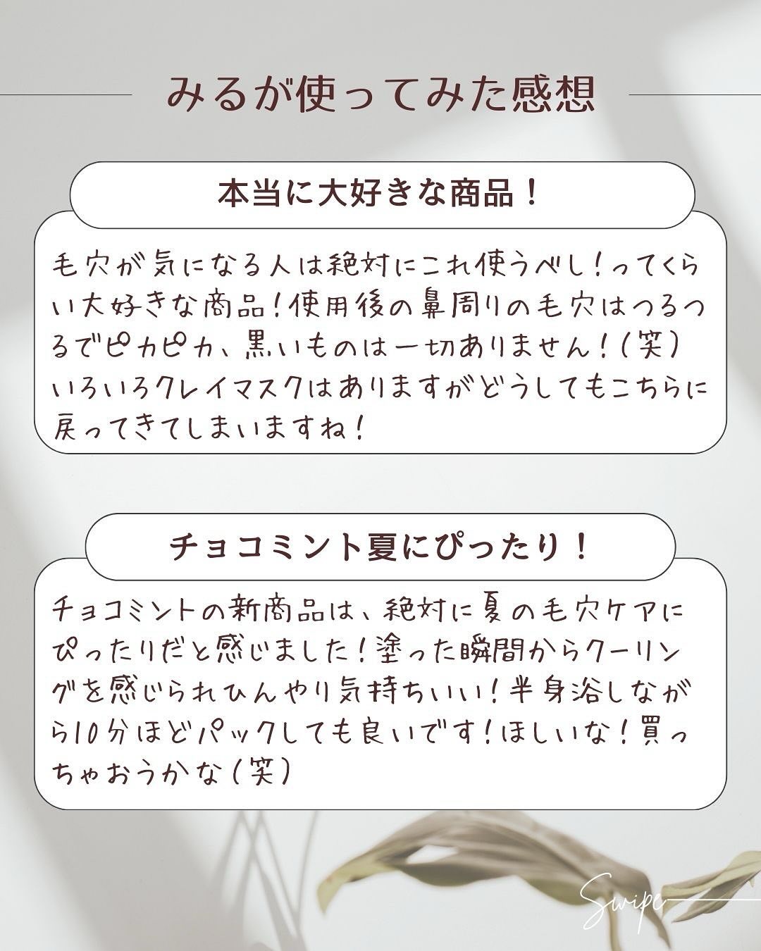 innisfreeスーパーヴォルカニック ポア クレイマスク クールミントチョコレートlipsでお友達が載せていたのを見て、すぐ買いにいきました。ラッシュのパワーマスクみたいな感じ、質感も似てる。目の周りを避け、塗ってしばらく放置。これ、洗い...