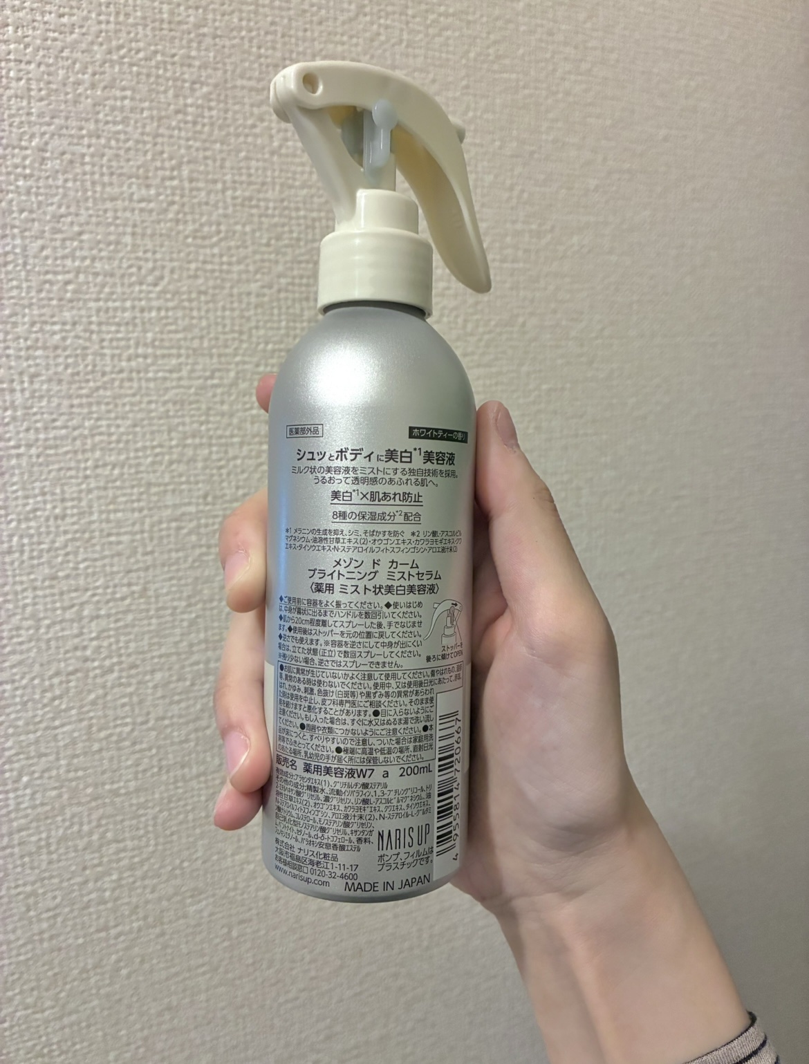 - 【医薬部外品】 片手でシュッとケアできる ミストタイプのボディ用美白*1美容液 ●ミルク状の美容液をナノサイズ化する独自技術で、肌の上にとどまりがちな保湿成分が角質層まで浸透。 ●べたつかずにしっかり潤って透明感のあふれる肌へ。 ●逆さにしても使えるトリガータイプのスプレーなので、背中のケアにも。 ●医薬部外品の有効成分【プラセンタエキス(1)】【グリチルレチン酸ステアリル】を配合し、全身の美白*1と肌あれ防止を叶えます。 ●ビタミン C 誘導体*2やセラミド*3・カンゾウエキス*4・オウゴンエキス・カワラヨモギエキス・クワエキス・タイソウエキス・アロエエキス*5などの植物性保湿成分配合。 ●アルコールフリー・無鉱物オイル・無タール系色素。 ●爽やかで心地よいホワイトティーの香り。 *1 メラニンの生成を抑え、シミ・ソバカスを防ぐ *2 リン酸 L-アスコルビルマグネシウム *3 N-ステアロイルフィトスフィンゴシン *4 油溶性甘草エキス(2) *5 アロエ液汁末(2) 販売名:薬用美容液W7 a