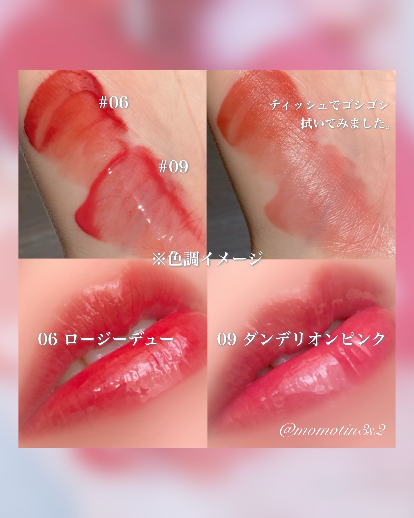 - みずみずしい果汁ツヤが続く、グロウティントミニ #01 やさしい春の日差しを含んだ桜ピンクカラーに、透明感あふれるグロッシーなツヤを重ねた、スプリングムードあふれるグロウティント。 #02 ティントとリップグロスを重ねたような、みずみずしく澄んだ果汁コーティング処方で、ひと塗りでぷるんとしたツヤ感を演出します。 #03 クリアで透明感のある果汁カラーが、重ねるほどにピュアで艶やかなグロウリップを叶えます。 #04 保湿オイルをたっぷり配合し、美しい発色はもちろん、乾燥や角質を気にせず、長時間うるおいが続くリップケア効果も実現。 咲き誇る花々の香りの中で、最も甘くやさしく広がる Sweet Blossom. ほんのりと広がっていくピンクピーチと春の旅路を、ぜひご一緒にお楽しみください。