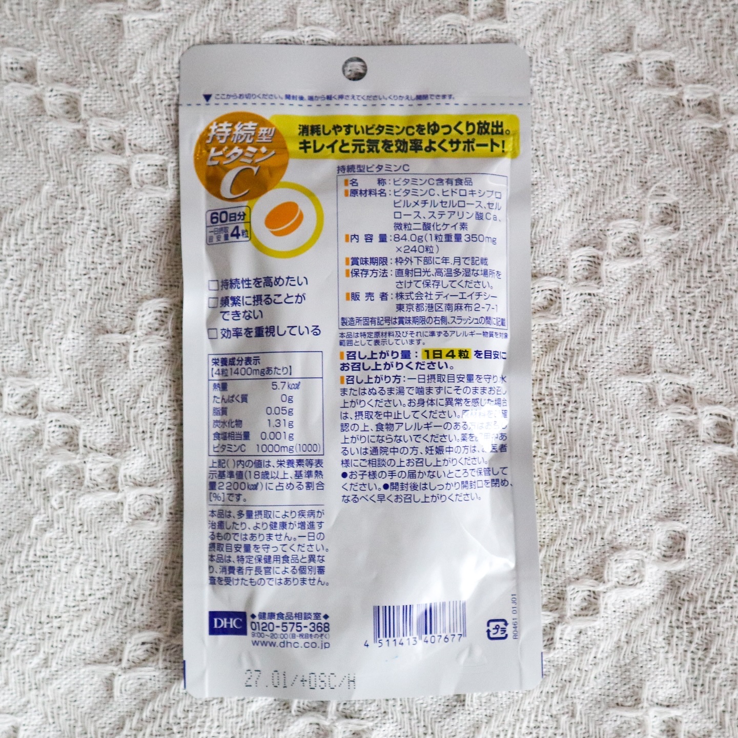 - 消耗しやすいビタミンCが「タイムリリース処方」で体内でゆっくり溶け出し、長時間とどまります。 1000mg(一日摂取目安量あたり)のビタミンC配合で、キレイと元気を効率よくサポートします。 栄養機能表示 ビタミンCは、皮膚や粘膜の健康維持を助けるとともに、抗酸化作用をもつ栄養素です。 ※水またはぬるま湯で噛まずにそのままお召し上がりください。 ※本品は、多量摂取により疾病が治癒したり、より健康が増進するものではありません。一日の摂取目安量を守ってください。 ※本品は、特定保健用食品と異なり、消費者庁長官による個別審査を受けたものではありません。 【名称】 ビタミンC含有食品 【原材料名】 ビタミンC、ヒドロキシプロピルメチルセルロース、セルロース、ステアリン酸Ca、微粒二酸化ケイ素 【飲み方】 一日の摂取目安量4粒 【栄養成分表示[4粒1400mgあたり]】 熱量5.7kcal、たんぱく質0g、脂質0.05g、炭水化物1.31g、食塩相当量0.001g、ビタミンC 1000mg(1000) ※上記( )内の値は、栄養素等表示基準値(18歳以上、基準熱量2200kcal)に占める割合[%]です。 ※一日の目安量を守って、お召し上がりください。 ※お身体に異常を感じた場合は、摂取を中止してください。 ※特定原材料及びそれに準ずるアレルギー物質を対象範囲として表示しています。原材料をご確認の上、食物アレルギーのある方はお召し上がりにならないでください。 ※薬を服用中あるいは通院中の方、妊娠中の方は、お医者様にご相談の上お召し上がりください。 ●直射日光、高温多湿な場所をさけて保存してください。 ●お子様の手の届かないところで保管してください。 ●開封後はしっかり開封口を閉め、なるべく早くお召し上がりください。 食生活は、主食、主菜、副菜を基本に、食事のバランスを。