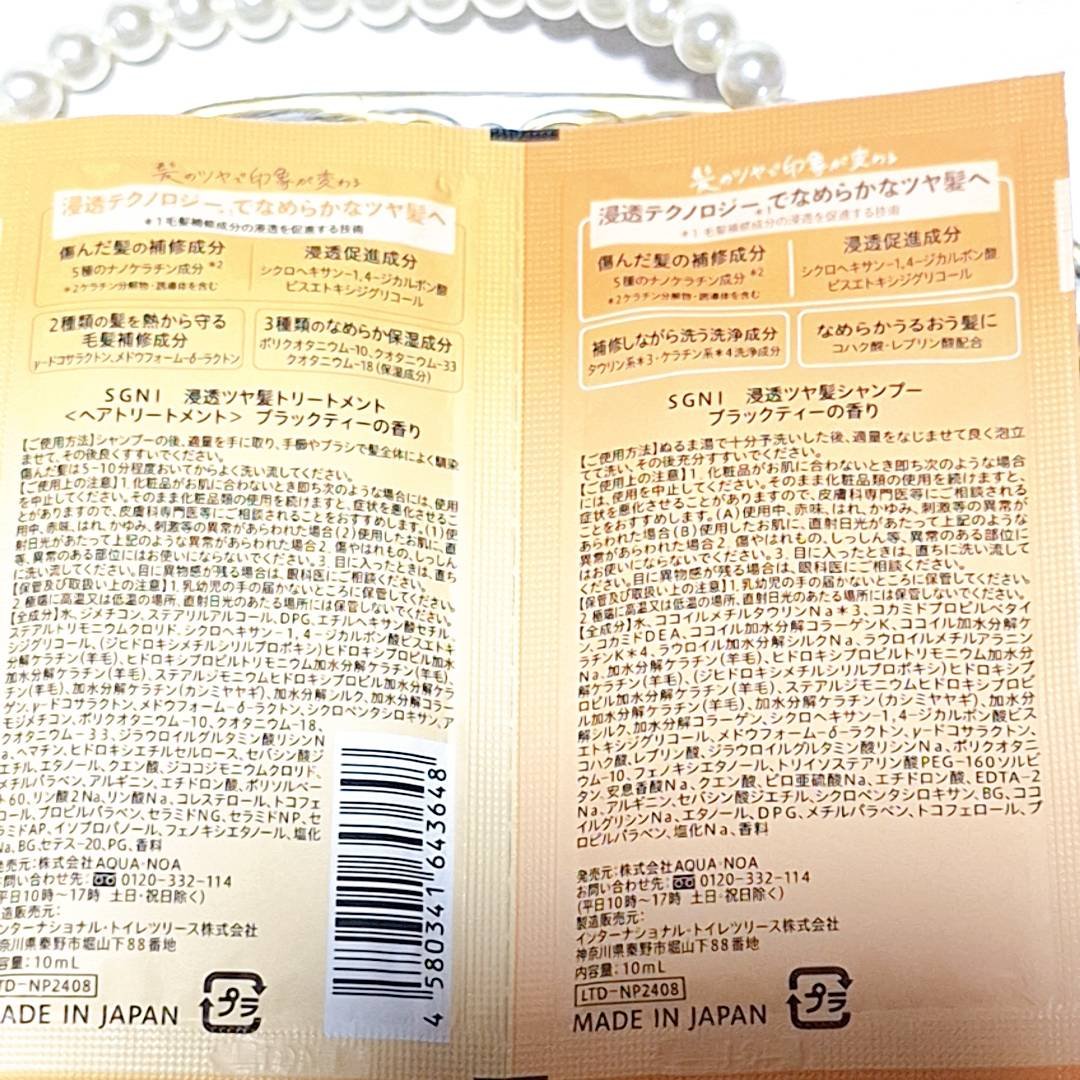株式会社アクア・ノア野島様からサシェットをいただきました!SGNI(スグニ)浸透ツヤ髪シャンプー/トリートメントブラックティーの香り気になってたSGNIの新作!使わせていただきました!✨シャンプーは、タウリン系の優しい洗浄成分*がメインで、頭...
