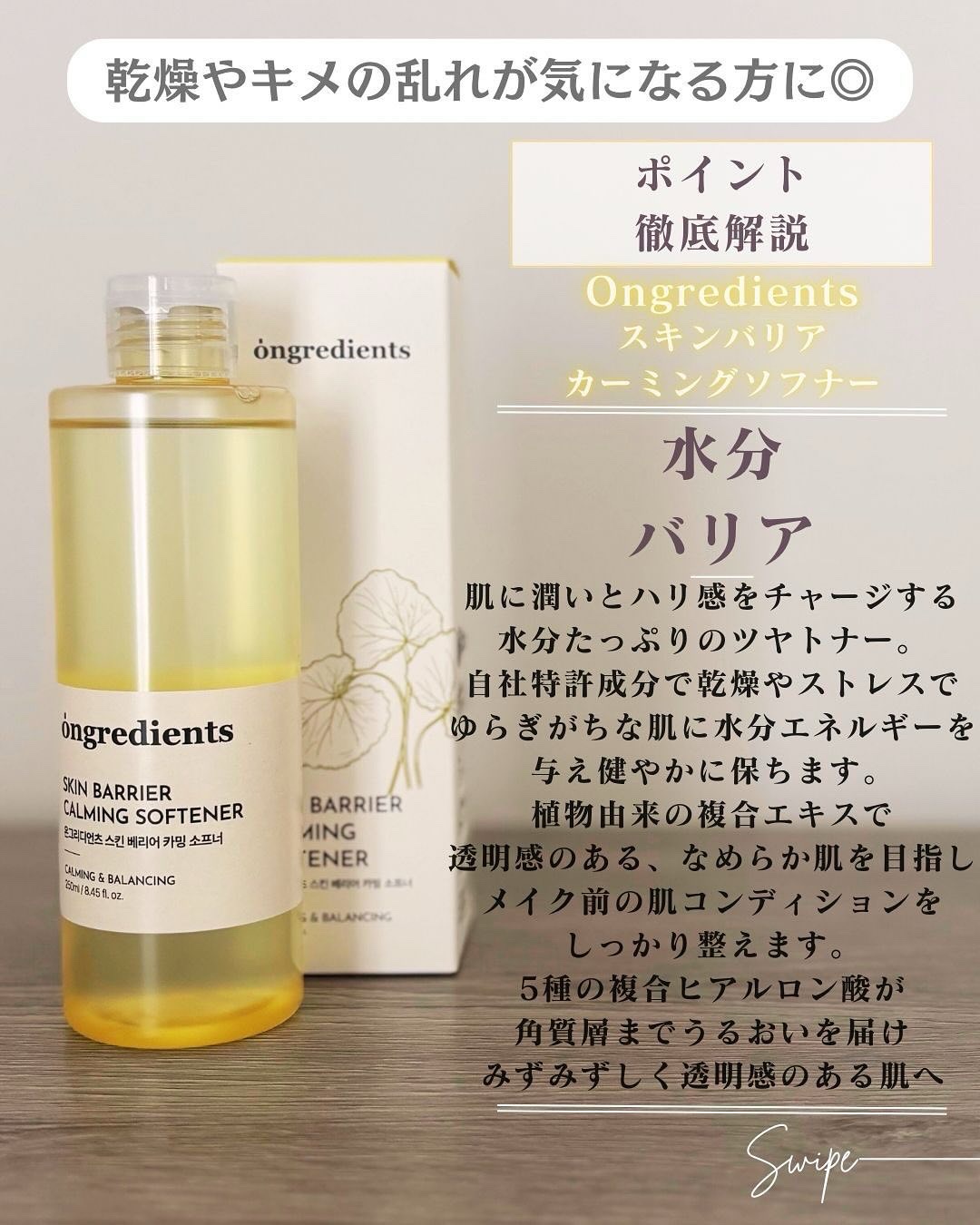 Ongredientsスキンバリアカーミングソフナーインナードライと毛穴をケアし、敏感肌にも優しい高保湿トナー💫ツボクサエキスとヒアルロン酸配合。ゆらぎ・赤みケア+角質・キメを整え、メイク前の肌コンディションを底上げ!サラッとウォーターリーテ...