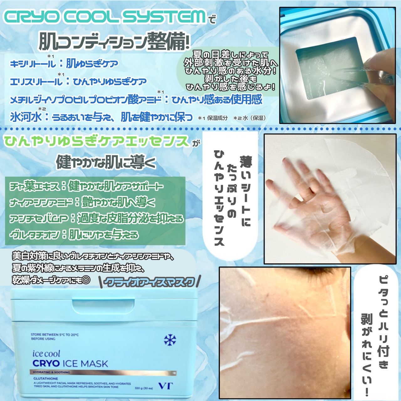 VTから新発売!この暑い季節にぴったりのシートマスク❄️クライオアイスマスク🧊肌につけた瞬間にひんやり!気持ちいい✨夏は毎日使いたいくらいよかった😭💓氷河水&グルタチオン配合アイスマスク❄️メイク前に使って肌を冷やすのも◎食品にも使用されるキ...