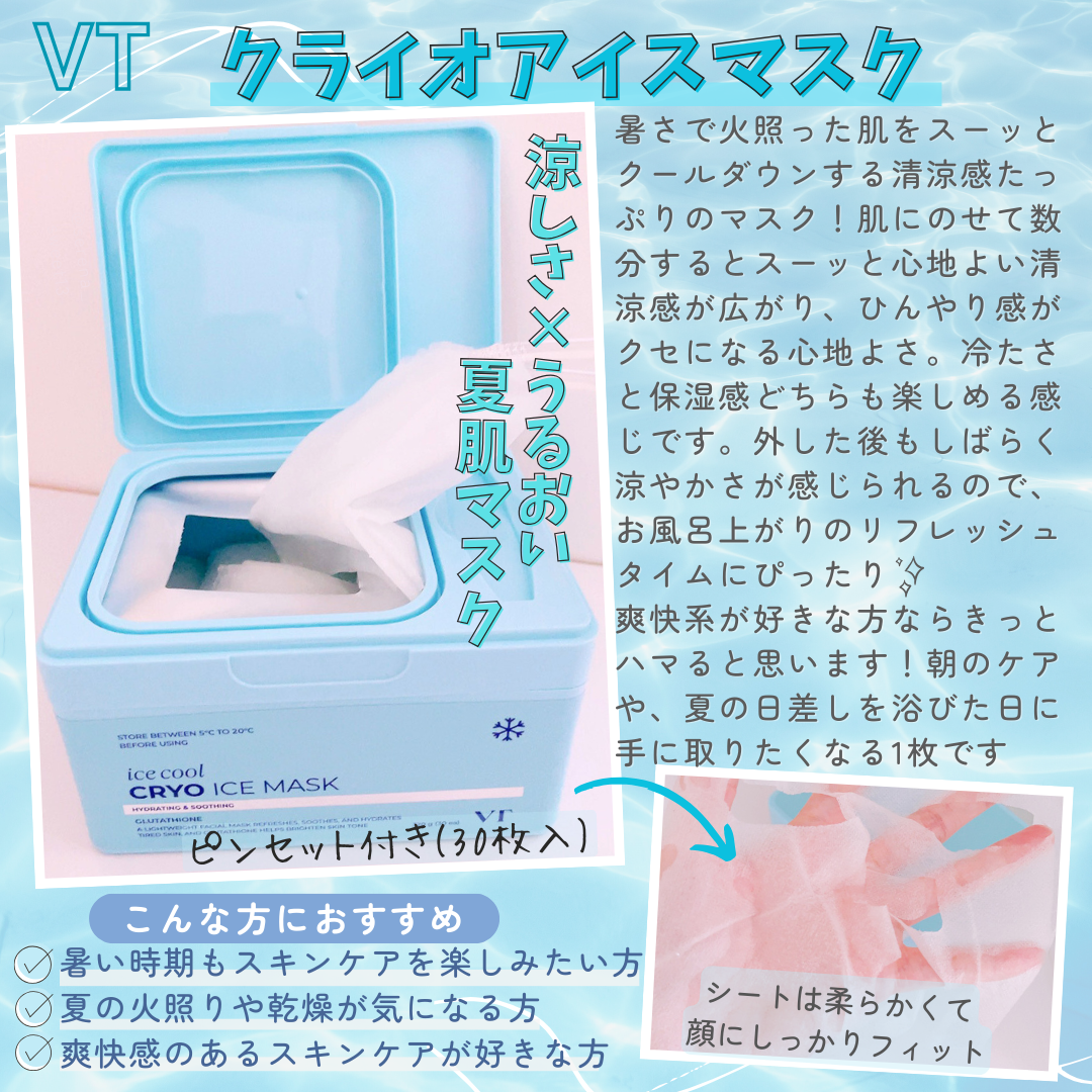 火照るお肌をひんやりうるおす、夏のアイスマスク🧊✼••••✼••••✼VTクライオアイスマスク✼••••✼••••✼VTさまよりいただきました🕊夏のスキンケアにぴったりな、VTの新作「クライオアイスマスク」。紫外線を浴びた肌をひんやりクールダ...