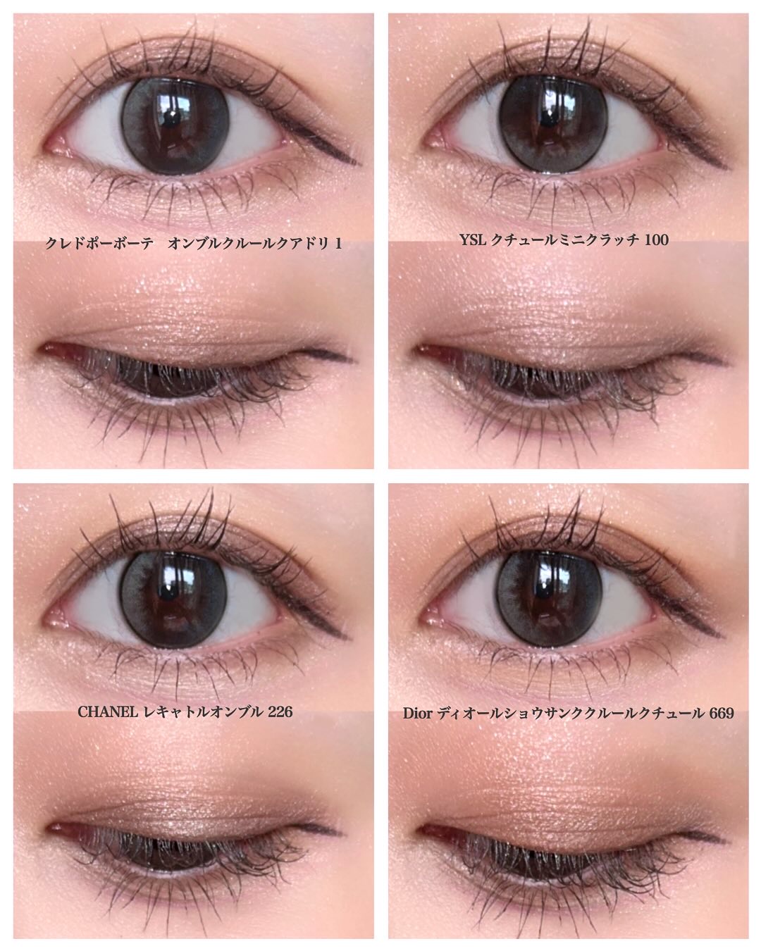 ブルベ夏大歓喜ナチュラル盛れシャドウ♡/ 左下のピンクシャドウをアイホール全体に 上の段のどちらかを二重幅に 右下を目尻に使ってるよ〜💟 上の左側の色がラメたっぷりで影感を出してくれるグレーブラウンなのでこれを使うことがおおいかも🤔