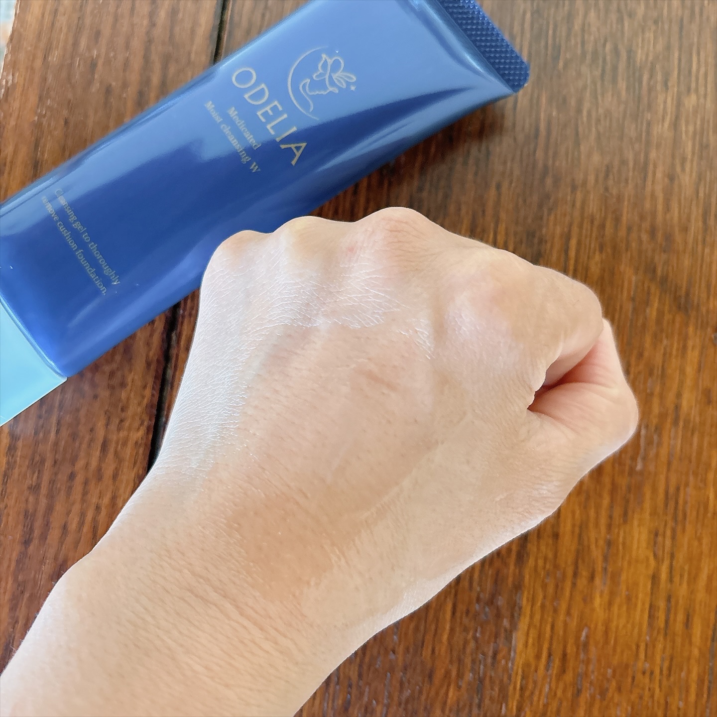 半透明のジェルはとろみのあるテクスチャーながら、適度なゆるさもあり、とっても伸びが良く、メイクとのなじみも良かったです。 こちらのODELIA(オディリア)薬用モイストクレンジングジェルをメイクになじませ、洗い流すとしっかりオフできていました。 単なるメイクを落とす役割のクレンジングではなく、「メイク落とし」「洗顔」「毛穴ケア」「保湿」4つの役割をはたしてくれるところも魅力的な商品です。