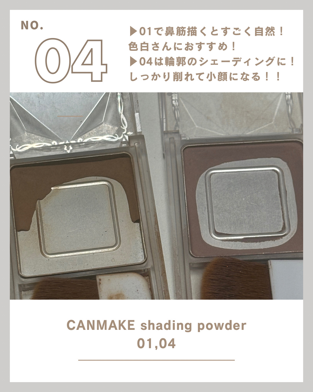 キャンメイクシェーディングパウダー05ムーングレージュというカラーです。これは日本人の肌に合う色だと思います!748円(安すぎ)ドラストで購入できます。 粉質はサラサラで、筆付きなのでめちゃくちゃ楽ちんです。ありがとう。底見えまでに3年かかってるのでコスパもいいです。 色味は本当に肌に馴染みます。自然。ナチュラル。ナチュラルボーン。