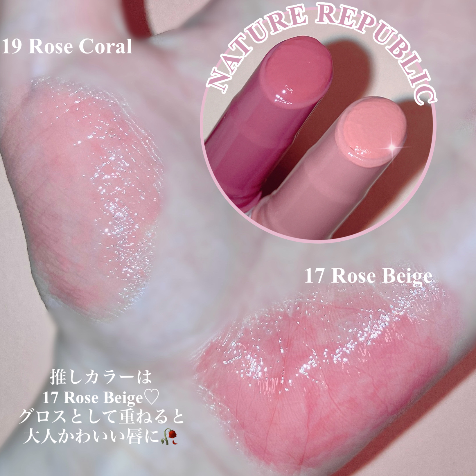 #PR\ 新色ローズライン🌹/ネイチャーリパブリック◾︎ハニーメルティングリップローズ17RoseBeige19RoseCoral大人気の蜂蜜のようにとろけるリップから4色の新色が登場したよ♪発色の仕方やツヤ感がめちゃ可愛い♡他のカラーも気に...
