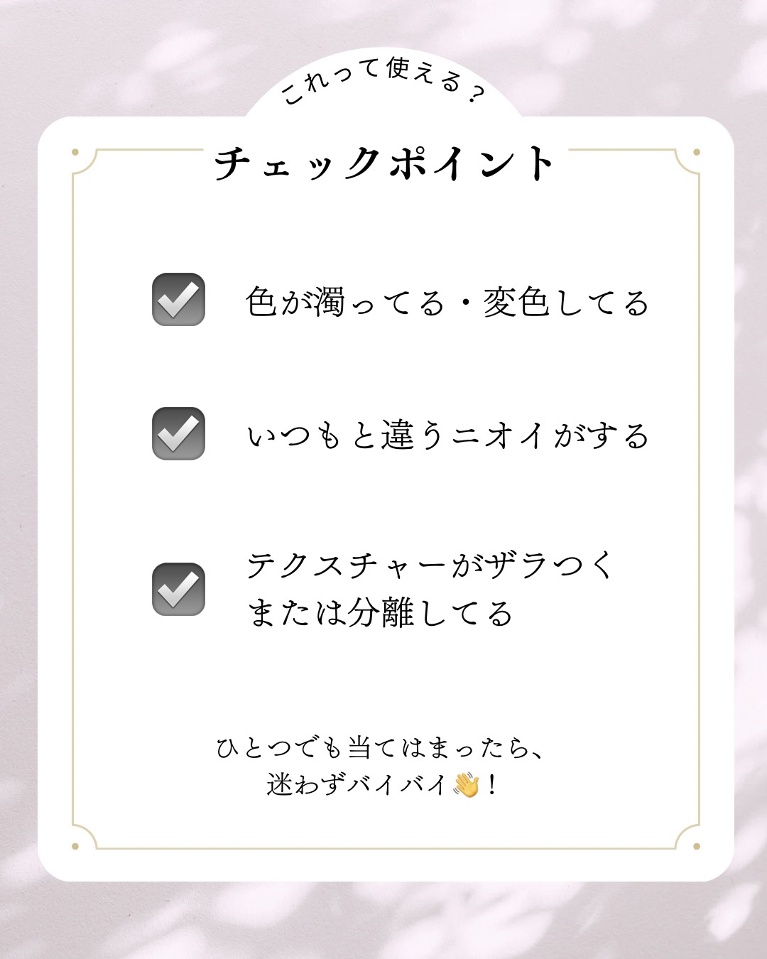 使用期限を意識するだけで、気持ちよくケアができるし、お肌もきっと喜びますよね🌿 年末の大掃除に向けて各アイテムごとの目安を分かりやすく整理したので、年末の大掃除の際にぜひ役立ててください🙆♀️ 自分のためにキレイになりたい✨ ただのコスメ&美容・好きのOLが “きゅん”とくる美容系アイテムをご紹介しています🩵
