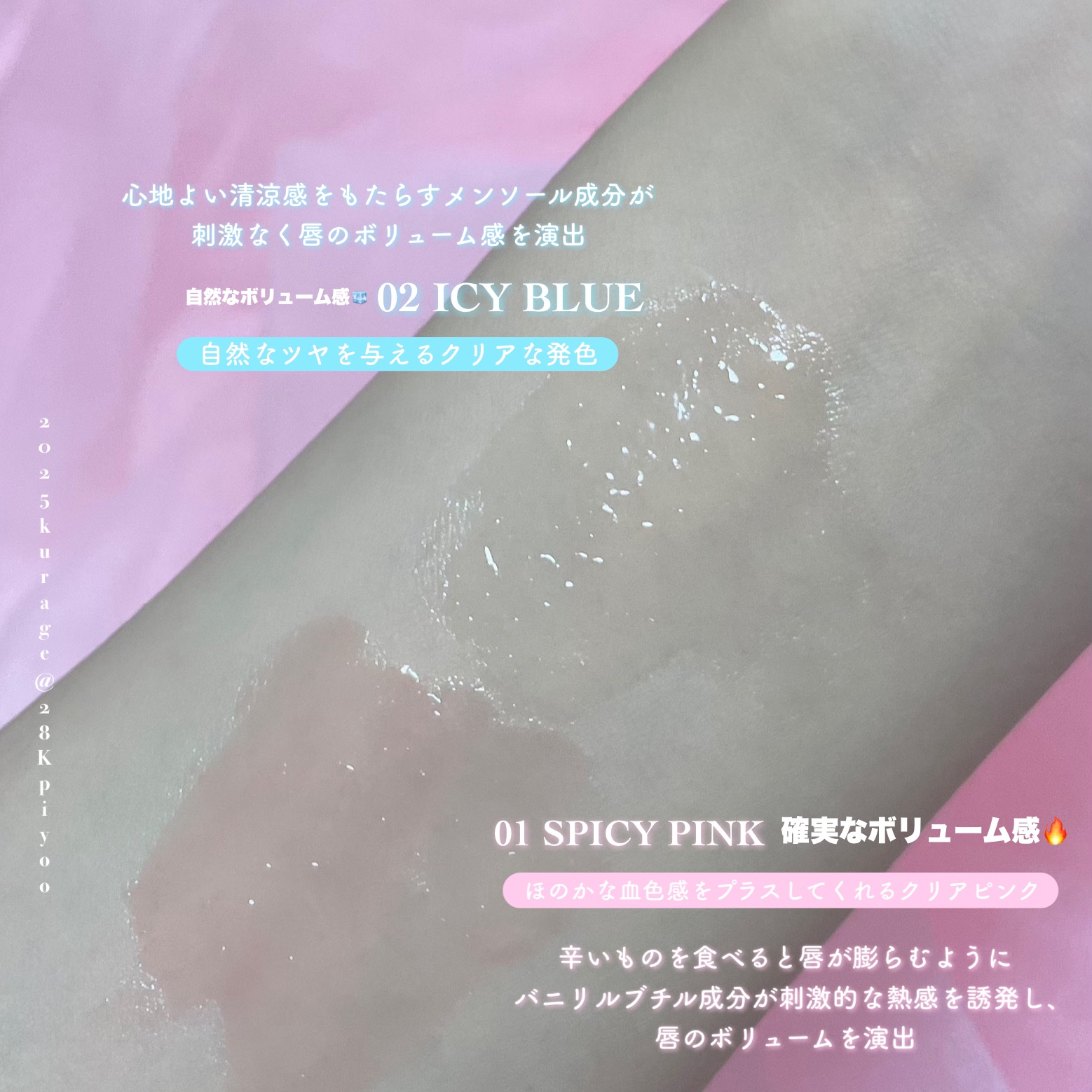 - 上質なツヤでふっくらとしたボリューム感*1のある唇を演出するデイリーリッププランパー 唇に触れた瞬間とろけるメルティングテクスチャーが唇に光沢を出し、ぷるんとした唇に仕上げるプランピングリップバームです。 ✓好みに合わせたHOT & COOLの2タイプを展開 しっかりボリューム感を演出したい上級者向けのスパイシーピンク(HOT)は、バニリルブチル成分*2が刺激的な熱感を誘発し、ボリューム感*1のある唇に仕上げます。カラーはクリアなピンク。 マイルドな使用感と自然なボリューム感を演出したい初心者向けのアイシーブルー(COOL)は、心地よい清涼感をもたらすメンソール成分*3がクールな優しい使用感で、ボリューム感*1のある唇に仕上げます。カラーはクリア。 ✓独自成分VOLU-FORM *4と植物性保湿オイル*5で、しっとりと角質層まで溶け込んでふっくらとハリを与える 独自の高純度プランピング原料*6で唇のハリと弾力をケア。 植物性保湿オイル*4が配合で、美容保湿成分も届けることができ、乾燥くすみをケアして明るい印象の健やかな唇を保ちます。 ✓リップの上からでも綺麗に重ね塗りができるシロップのようなテクスチャー 透明に近いクリアなカラーでカラーリップの上に重ねて塗っても本来の色をそのまま生かし、艶やかにコーティングしてくれます。 *1メイク効果 *2肌に温熱感を与えるのに役立つ成分 *3さわやかな清涼感が特徴で、収れん効果、整肌効果をサポートする成分 *4高純度プランピング原料で、肌のハリと弾力ケアに役立つ(パルミトイルイソロイシン) *5各種フルーツオイルが配合され、唇に潤いを与えての乾燥くすみをケア(アップルオイル、ラズベリー種子油、カニナバラ果実油、ヒポファエラムノイデス果実油) *6パルミトイルイソロイシン