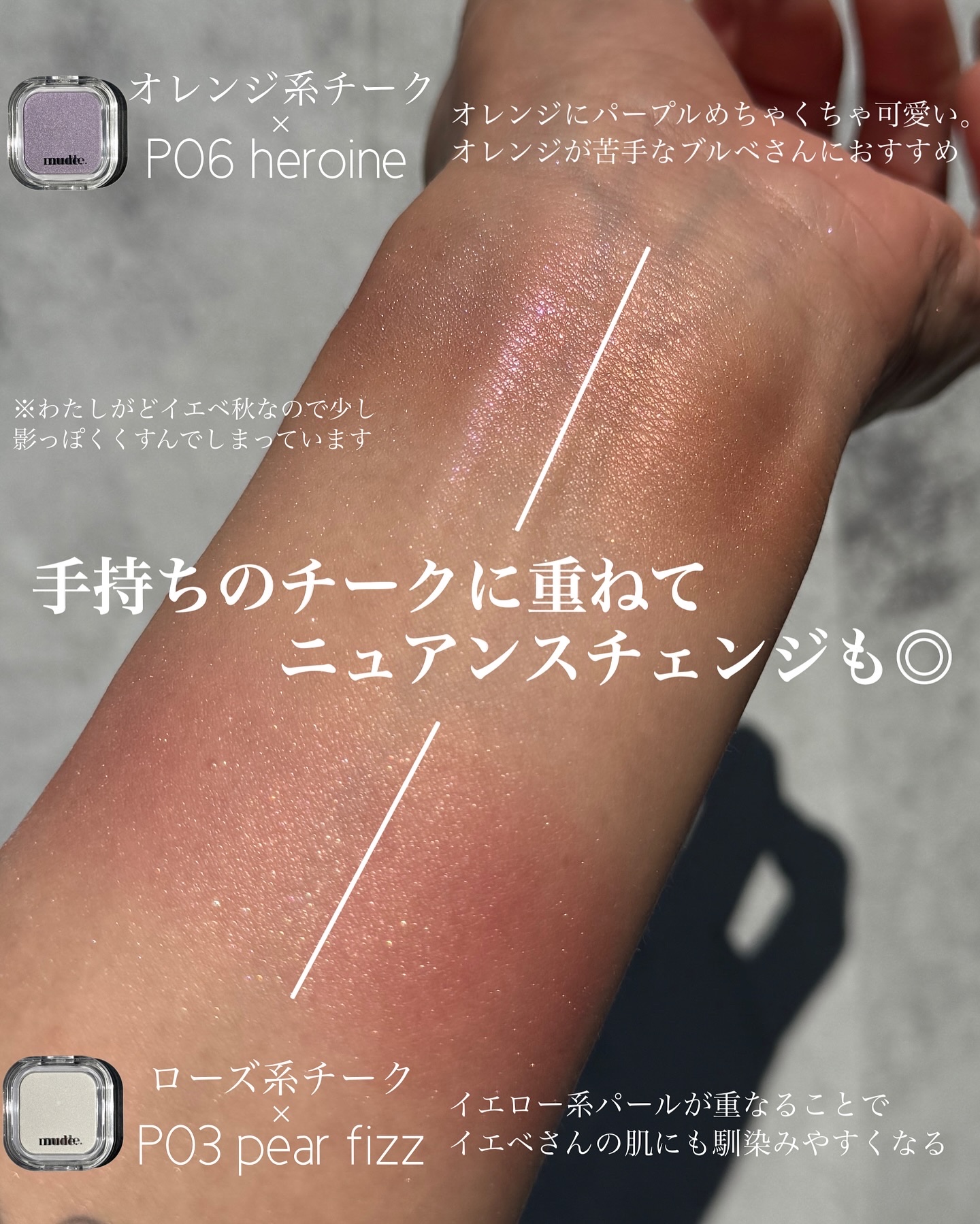 ミュードの新作フェイスフィルボリューマーハイライターを使ってみたよ🥰光が当たるとツヤ感とパール感が本当にかわいくて、自然な立体感が出るのが嬉しい。重ねても厚塗りにならず、肌になじむ仕上がり。P02マス、P05バレリーナは5/31発売!持ち歩き...