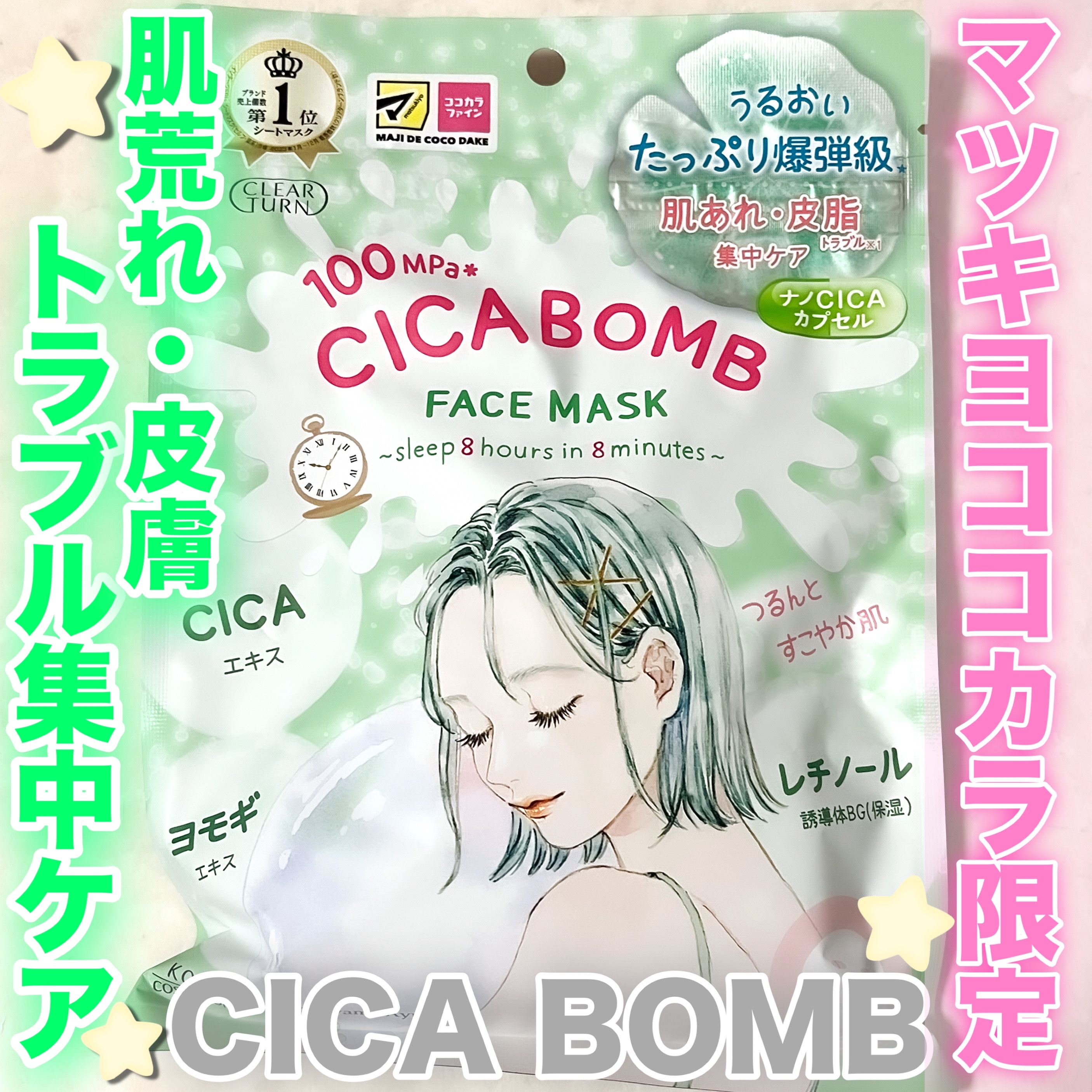 🌻クリアターン🌻💙CICABOMB💙投稿ご覧いただきありがとうございます😉👍️パケも可愛いくてひかれますよね💙こちらはマツキヨ、ココカラファインで購入可能のパック‼️CICAエキス他、ヨモギエキス、レチノール配合💜肌荒れや皮脂トラブルを集中ケ...