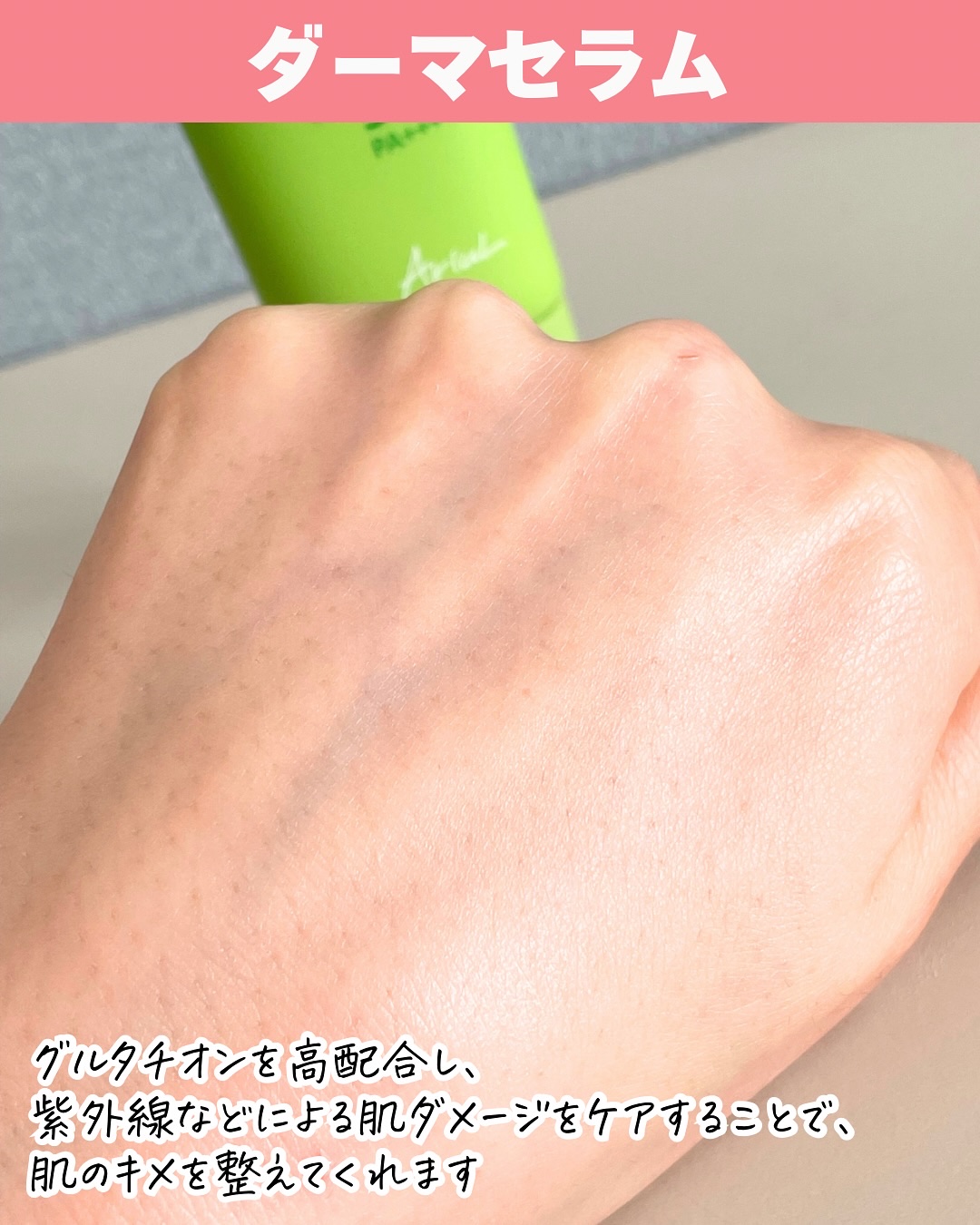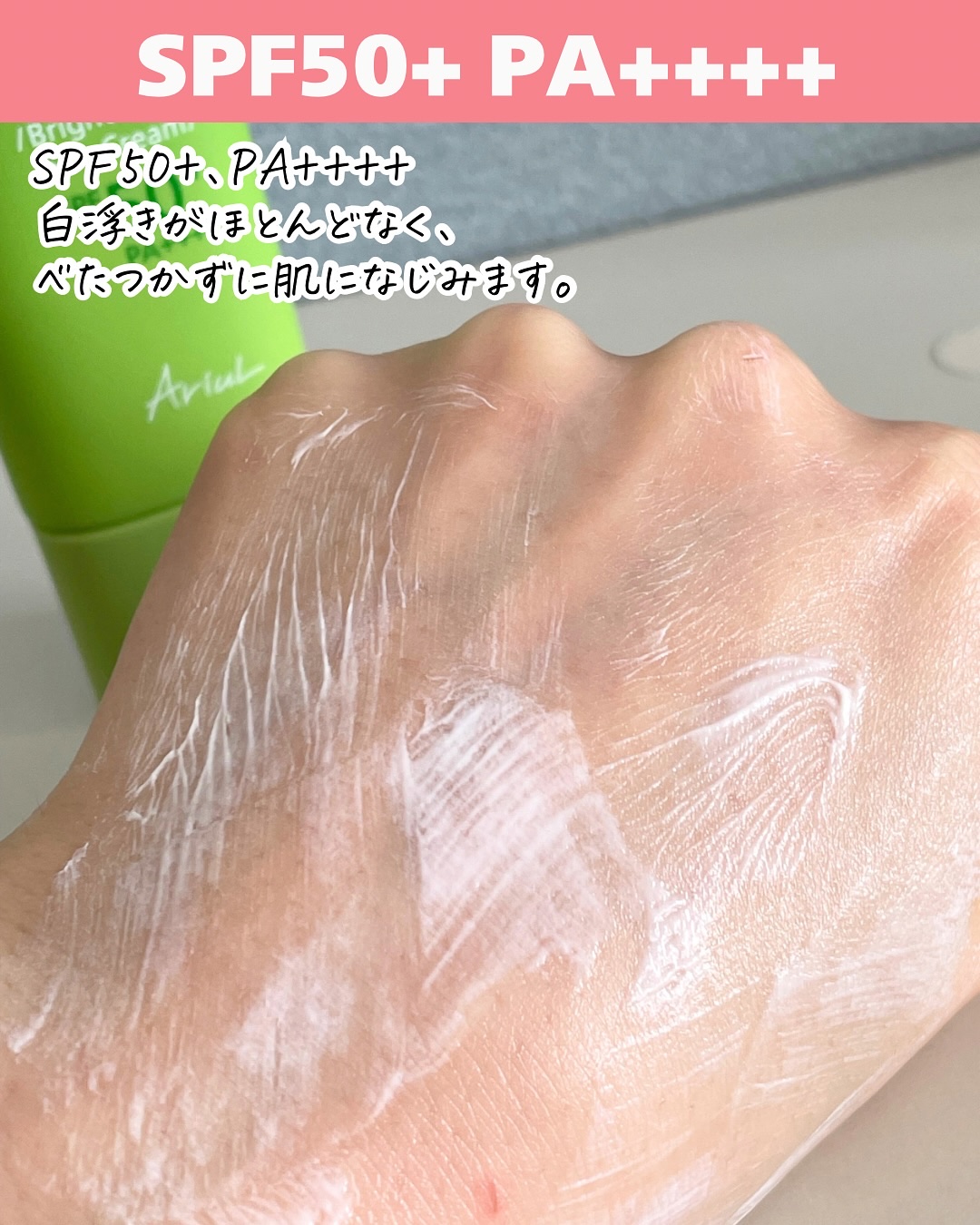 AriulグリーンビタミンC※※製品の抗酸化剤ブライトニングサンクリームSPF50+、PA++++日焼けの感触が苦手な方でも使いやすいかもしれない水分クリームみたいなテクスチャでべたつかずにしっとりしたサンクリームケミカルタイプとノンケミカル...
