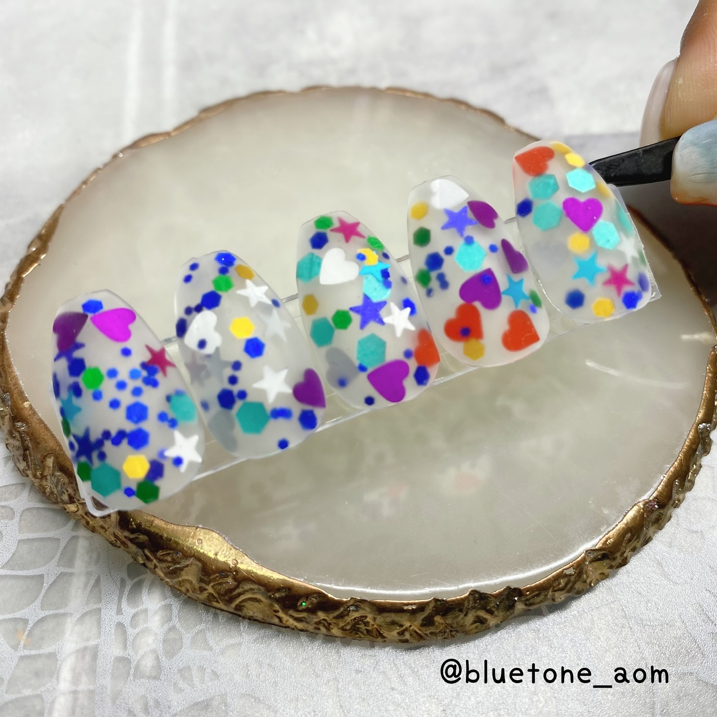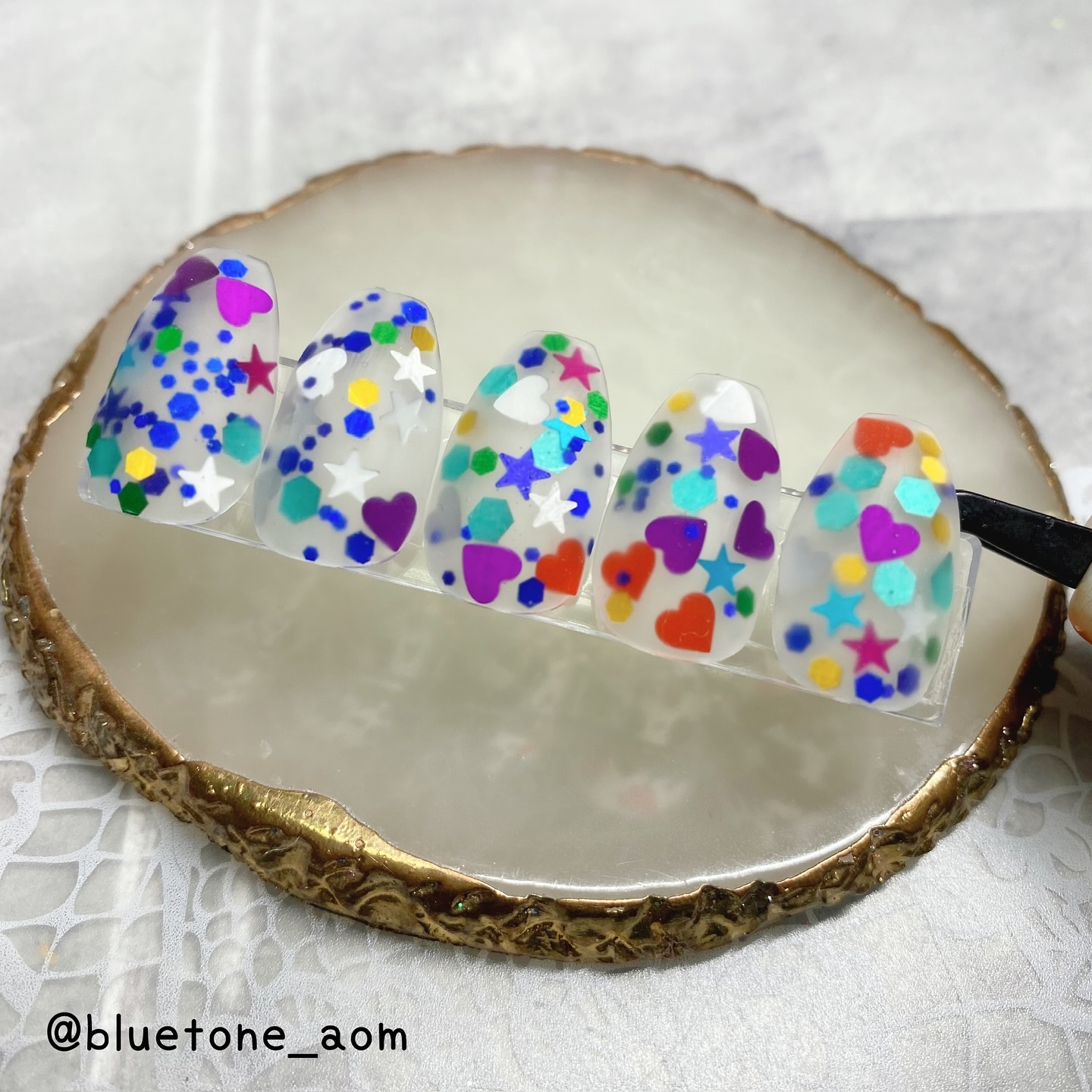 ラメがしっかりしてるし クリアカラーが入ってるから オーロラパウダー無しでも 充分キラキラしました! 反射強めのフィルムなので 実物はもっと うるうるとキラキラが強いです! ビー玉みたい🥺 ネイルシール長持ちさせたいけど ちょっと飽きてきたな〜って時とかに 全然違った印象になるのでオススメです! Seriaのベースジェル 本当にうるうるネイルしやすいので オススメしたい🙆♀️