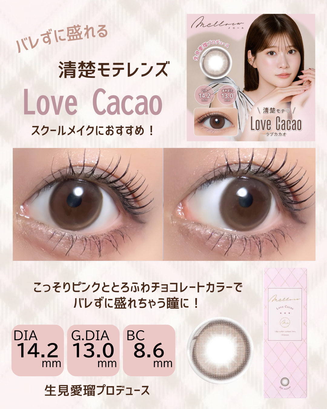- ※2025年6月以降、商品パッケージ裏面・側面の一部表記を順次変更いたします。尚、これにかかる商品の交換・返品は承っておりません。 ふわっと漂う多幸感 キラキラとした瞳 そんな多くの人が憧れる印象はmelloewで作れる! 王道盛れからあざと盛れまでどんな盛れも叶うラインナップで瞳をコーディネート☆ Cotton Ring(コットンリング) DIA14.2㎜/着色直径13.5㎜ 溶け込みベージュ×くっきりフチ 写真でもリアルでも盛れちゃう♪ Silky Pearl(シルキーパール) DIA14.2㎜/着色直径13.5㎜ ツヤっぽベージュ×細フチ 垢抜けた印象にしたい方におすすめ♪ Truffle Gray(トリュフグレー) DIA14.2㎜/着色直径13.4㎜ おしゃれモテ♡ 濃いめグレージュ×ぼかし細フチ 品よく盛れるお嬢様な瞳に Pure Nude(ピュアヌード) DIA14.2㎜/着色直径13.2㎜ 絶妙ヌーディカラー×グラデフチ お仕事やカラコン初心者にもおすすめ♪ Brown Chou(ブラウンシュー) DIA14.2㎜/着色直径13.6㎜ まろやかブラウン×ぼかしフチ 日常使いにもおすすめ♪ Mocha Powder(モカパウダー) DIA14.2㎜/着色直径13.6㎜ リピ確モテ♡ ふわふわモカ×くりっとフチ 絶対盛れちゃう甘い瞳に Love Cacao(ラブカカオ) DIA14.2㎜/着色直径13.0㎜ 清楚モテ♡ とろふわチョコレート×こっそりフチ バレずに盛れちゃう瞳に カラーコンタクトレンズの不適正使用による眼障害の危険性等などがあります。 ●コンタクトレンズは高度管理医療機器です。不十分な洗浄・消毒など不適切なケアや、長時間・交換期間を超えた装用により、アレルギー性結膜炎、角膜感染症、角膜潰瘍等の重篤な眼障害が発生する危険性があります ●ご使用前に取扱説明書を確認してください 使用上の留意事項 ●眼科医院等を受診してからお求めください ●眼に異常を感じたら直ちにレンズ使用を中止し、お近くの眼科等で診察を受けてください ●医師の指示にしたがってご使用ください ●コンタクトレンズを装用する場合、自覚症状がなくても、眼科医院等での定期検査を受けてください ●レンズに不具合がある場合は使用しないでください