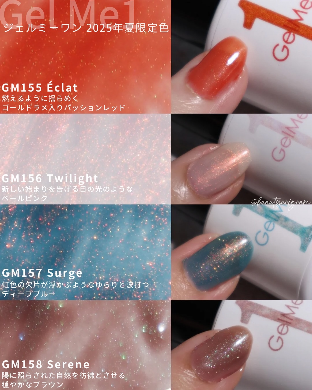 GelMe1から夏の限定色が発売🌞『éclat』"たくさんの輝きの中で、泳ぎ続ける"がテーマのトレンドカラー4色それぞれにラメが入っていて繊細な輝きが美しい✨▫️GM155Éclat(エクラ)燃えるように揺らめくゴールドラメ入りパッションレッ...