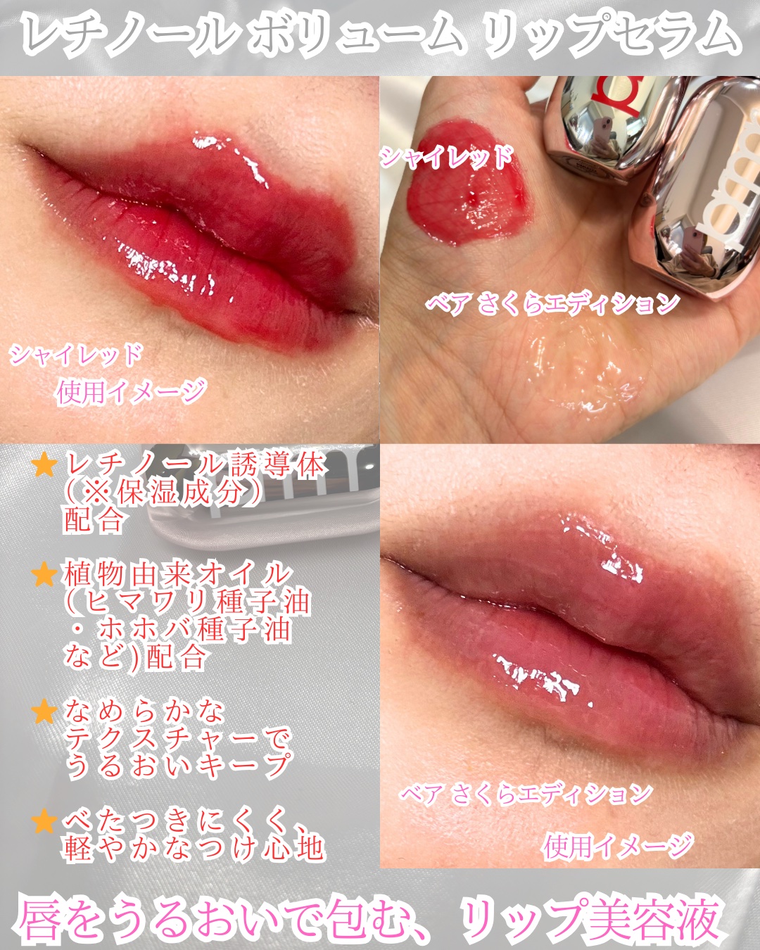 レチノールボリュームリップセラムさくらエディションベア[販売名]RVリップセラムベアレチノールボリュームリップセラムシャイレッド[販売名]RVリップセラムシャイレッドレチノール*1配合でメイクアップしながら縦ジワをケアしてボリューム感のあるツ...