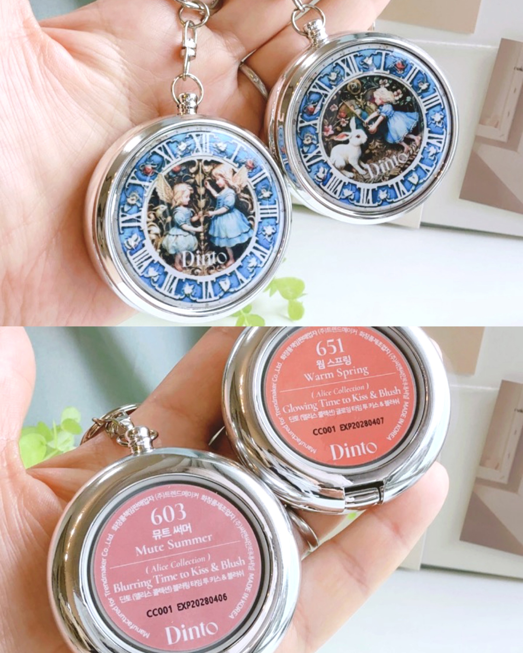 Dintoさまからいただきました🎁☑︎Dinto【アリスコレクション】ブラーリングタイムトゥーキスアンドチーク601ウォームスプリング/652クールサマーパケかわいすぎ😭!!大優勝😭!!パカっと開けるとなかには3色のリップ&チーク🙌マットタイ...