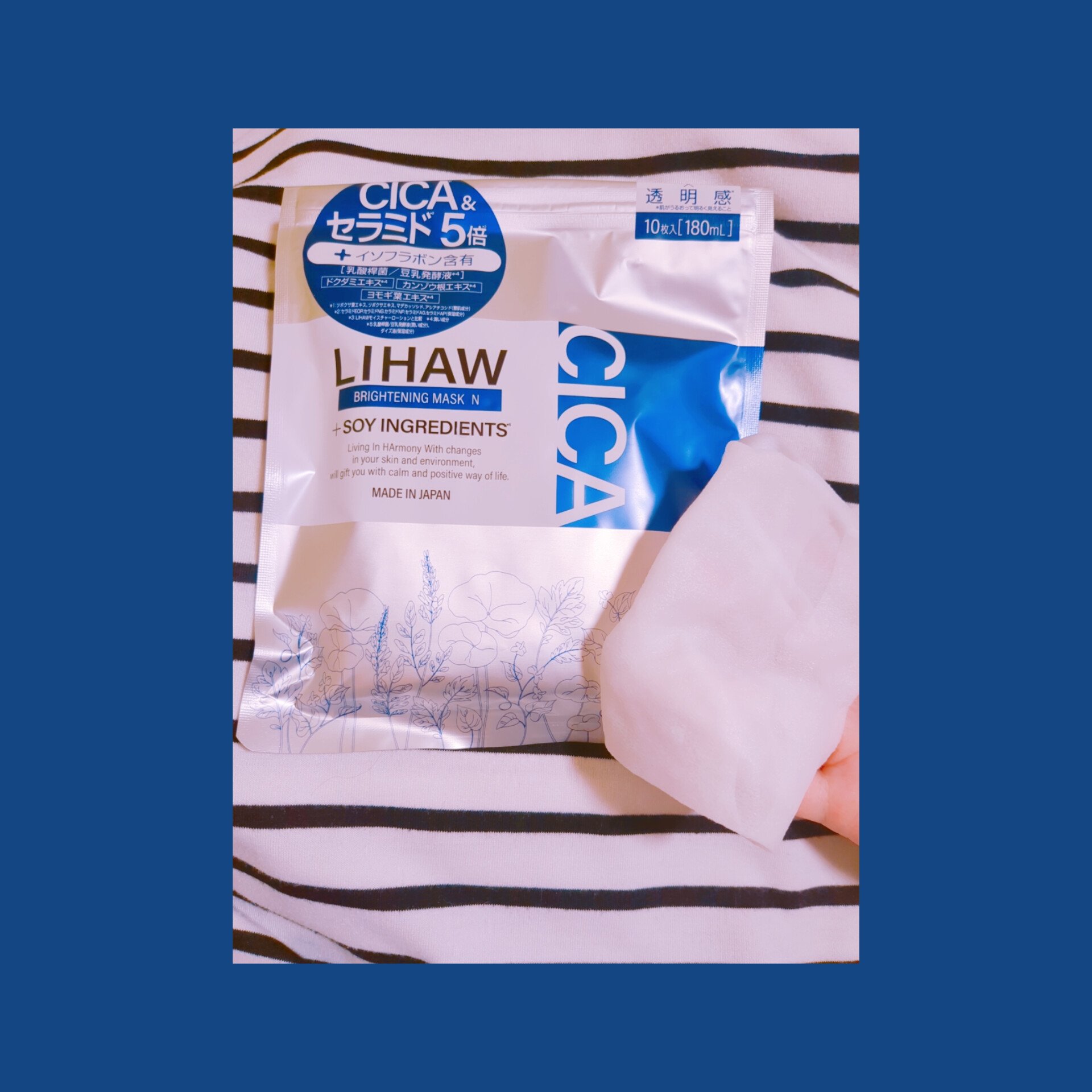 LIHAWブライトニングマスクCICA成分*35倍配合*4+イソフラボン含有(乳酸桿菌/豆乳発酵液*1)配合のブライトニングマスクほどより厚みのシートは伸縮性◎少し大きめなので全顔カバーぴたっと密着エッセンスがたっぷりみずみずし...