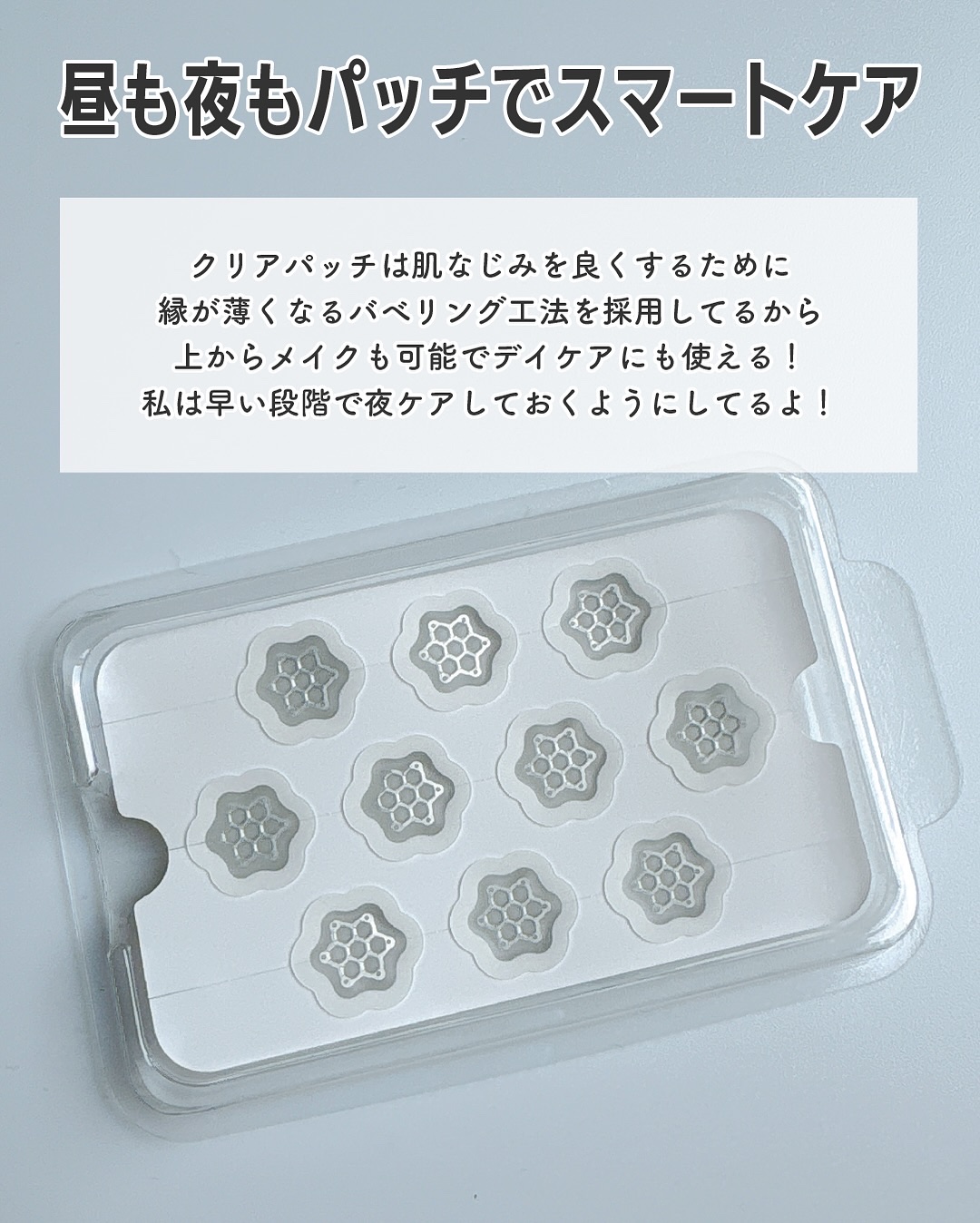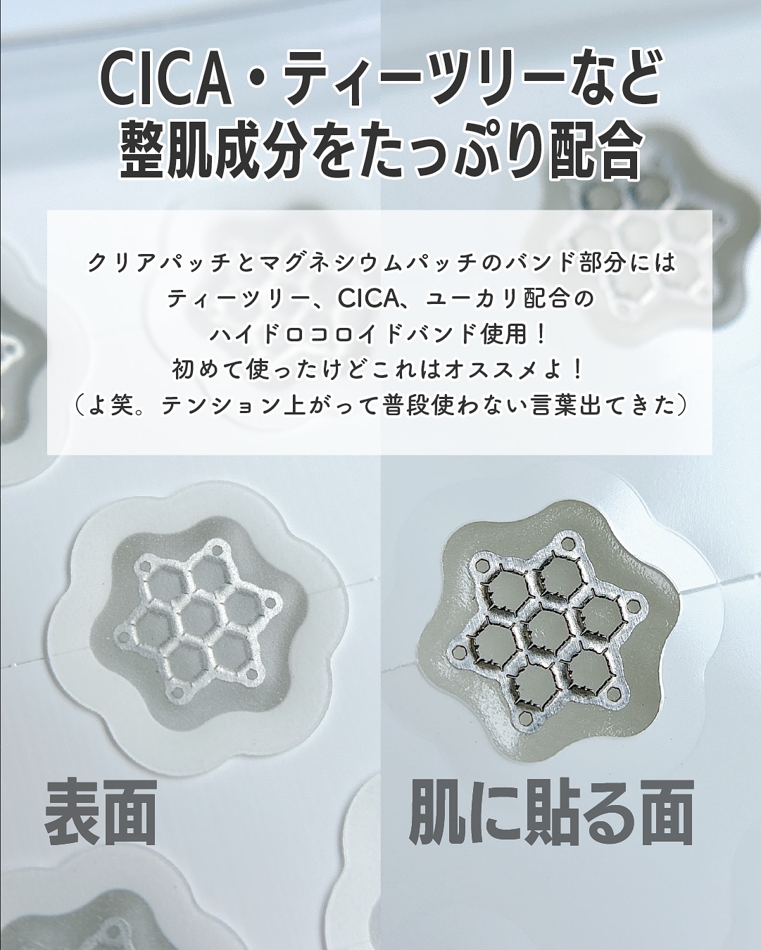 - 肌のバリア機能をサポートするマグネシウムニードル(整肌成分)を使用したパッチで、気になる部分の肌を整えます。 マグネシウムは人体必須ミネラルのひとつです。敏感になった肌にもご使用いただけます。
