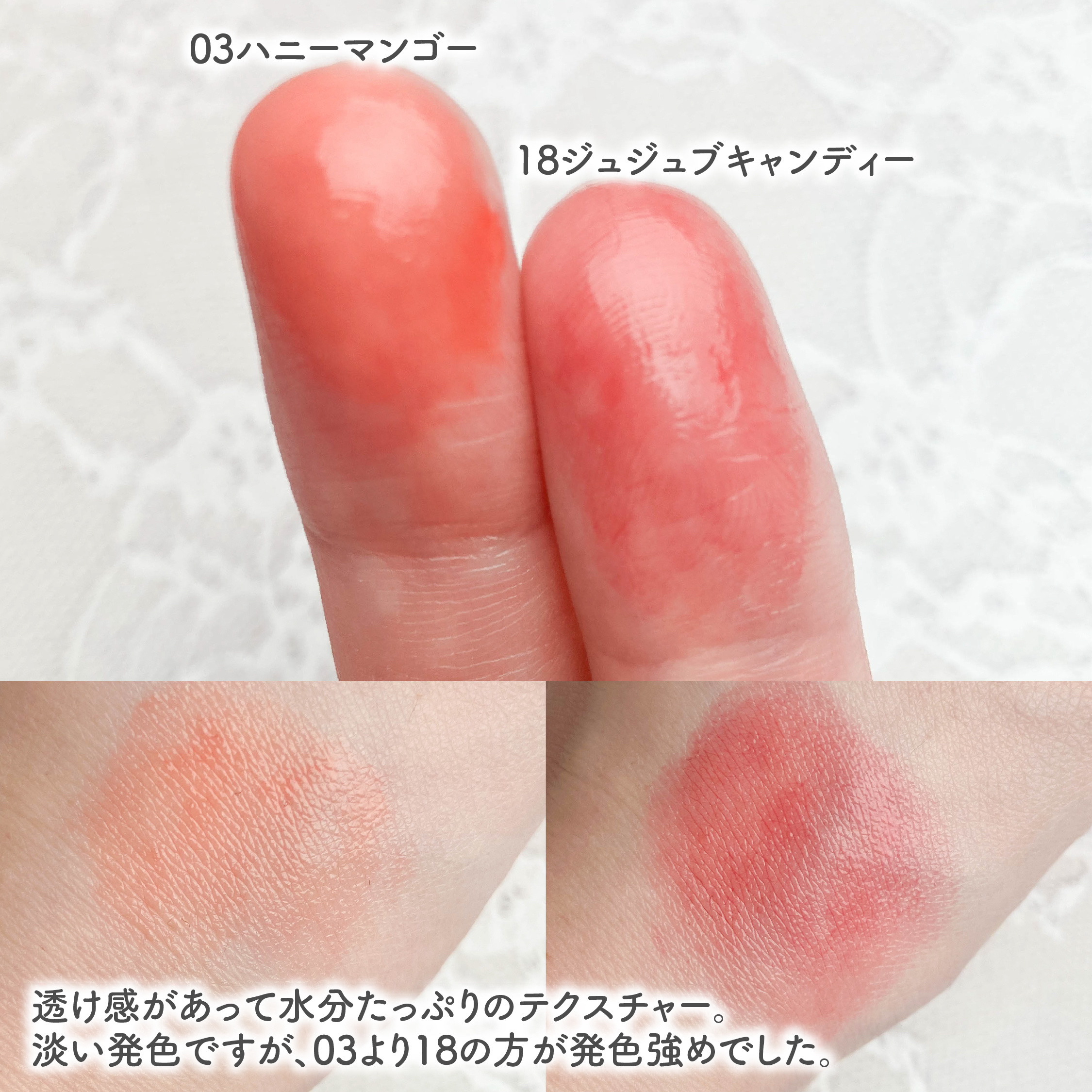 - <01 パパイヤクリーム> 水、ヘキサ(ヒドロキシステアリン酸/ステアリン酸/ロジン酸)ジペンタエリスリチル、トリエチルヘキサノイン、BG、グリセリン、オクチルドデカノール、ポリソルベート60、プロパンジオール、(PEG-240/デシルテトラデセス-20/HDI)コポリマー、1,2-ヘキサンジオール、セテアレス-20、フェノキシエタノール、エチルセルロース、カプリル酸グリセリル、(アクリル酸ヒドロキシエチル/アクリロイルジメチルタウリンNa)コポリマー、トリイソステアリン酸ポリグリセリル-2、リンゴ酸ジイソステアリル、酸化チタン、スクワラン、(アクリレーツ/アクリル酸アルキル(C10-30))クロスポリマー、トロメタミン、香料、エチルヘキシルグリセリン、黄4、赤104(1)、黄5、赤227、エチレンジアミンジコハク酸3Na、イソステアリン酸ソルビタン、ジイソステアリン酸ポリグリセリル-2、リナロール、ラウリン酸K、トコフェロール、青1 <02 ピーチドロップ> 水、ヘキサ(ヒドロキシステアリン酸/ステアリン酸/ロジン酸)ジペンタエリスリチル、トリエチルヘキサノイン、BG、グリセリン、オクチルドデカノール、ポリソルベート60、プロパンジオール、(PEG-240/デシルテトラデセス-20/HDI)コポリマー、1,2-ヘキサンジオール、セテアレス-20、フェノキシエタノール、リンゴ酸ジイソステアリル、酸化チタン、エチルセルロース、カプリル酸グリセリル、(アクリル酸ヒドロキシエチル/アクリロイルジメチルタウリンNa)コポリマー、トリイソステアリン酸ポリグリセリル-2、スクワラン、(アクリレーツ/アクリル酸アルキル(C10-30))クロスポリマー、トロメタミン、香料、エチルヘキシルグリセリン、黄5、赤104(1)、赤227、黄4、エチレンジアミンジコハク酸3Na、イソステアリン酸ソルビタン、ジイソステアリン酸ポリグリセリル-2、青1、リナロール、ラウリン酸K、トコフェロール <03 ハニーマンゴ> 水、ヘキサ(ヒドロキシステアリン酸/ステアリン酸/ロジン酸)ジペンタエリスリチル、トリエチルヘキサノイン、BG、グリセリン、オクチドデカノール、ポリソルベート60、プロパンジオール、(PEG-240/デシルテトラデセス-20/HDI)コポリマー、1,2-ヘキサンジオール、セテアレス-20、フェノキシエタノール、エチルセルロース、リンゴ酸ジイソステアリル、カプリル酸グリセリル、酸化チタン、(アクリル酸ヒドロキシエチル/アクリロイルジメチルタウリンNa)コポリマー、トリイソステアリン酸ポリグリセリル-2、スクワラン、(アクリレーツ/アクリル酸アルキル(C10-30))クロスポリマー、トロメタミン、香料、エチルヘキシルグリセリン、赤104(1)、黄5、赤227、黄4、エチレンジアミンジコハク酸3Na、イソステアリン酸ソルビタン、ジイソステアリン酸ポリグリセリル-2、リナロール、ラウリン酸K、トコフェロール、青1 <04 ピンクバブル> 水、ヘキサ(ヒドロキシステアリン酸/ステアリン酸/ロジン酸)ジペンタエリスリチル、トリエチルヘキサノイン、BG、グリセリン、オクチドデカノール、ポリソルベート60、プロパンジオール、(PEG-240/デシルテトラデセス-20/HDI)コポリマー、1,2-ヘキサンジオール、セテアレス-20、フェノキシエタノール、エチルセルロース、カプリル酸グリセリル、トリイソステアリン酸ポリグリセリル-2、(アクリル酸ヒドロキシエチル/アクリロイルジメチルタウリンNa)コポリマー、スクワラン、(アクリレーツ/アクリル酸アルキル(C10-30))クロスポリマー、リンゴ酸ジイソステアリル、酸化チタン、トロメタミン、香料、エチルヘキシルグリセリン、赤104(1)、酸化鉄、赤227、エチレンジアミンジコハク酸3Na、ジイソステアリン酸ポリグリセリル-2、黄4、イソステアリン酸ソルビタン、黄5、リナロール、ラウリン酸K、トコフェロール <05 アップルゼリー> 水、ヘキサ(ヒドロキシステアリン酸/ステアリン酸/ロジン酸)ジペンタエリスリチル、トリエチルヘキサノイン、BG、グリセリン、オクチドデカノール、ポリソルベート60、プロパンジオール、(PEG-240/デシルテトラデセス-20/HDI)コポリマー、1,2-ヘキサンジオール、セテアレス-20、フェノキシエタノール、トリイソステアリン酸ポリグリセリル-2、エチルセルロース、カプリル酸グリセリル、(アクリル酸ヒドロキシエチル/アクリロイルジメチルタウリンNa)コポリマー、スクワラン、(アクリレーツ/アクリル酸アルキル(C10-30))クロスポリマー、トロメタミン、香料、リンゴ酸ジイソステアリル、酸化チタン、エチルヘキシルグリセリン、赤227、黄5、赤104(1)、黄4、エチレンジアミンジコハク酸3Na、ジイソステアリン酸ポリグリセリル-2、イソステアリン酸ソルビタン、リナロール、ラウリン酸K、トコフェロール、青1 <06 クアバキャンディ> 水、ヘキサ(ヒドロキシステアリン酸/ステアリン酸/ロジン酸)ジペンタエリスリチル、トリエチルヘキサノイン、BG、グリセリン、オクチドデカノール、ポリソルベート60、プロパンジオール、(PEG-240/デシルテトラデセス-20/HDI)コポリマー、1,2-ヘキサンジオール、セテアレス-20、フェノ