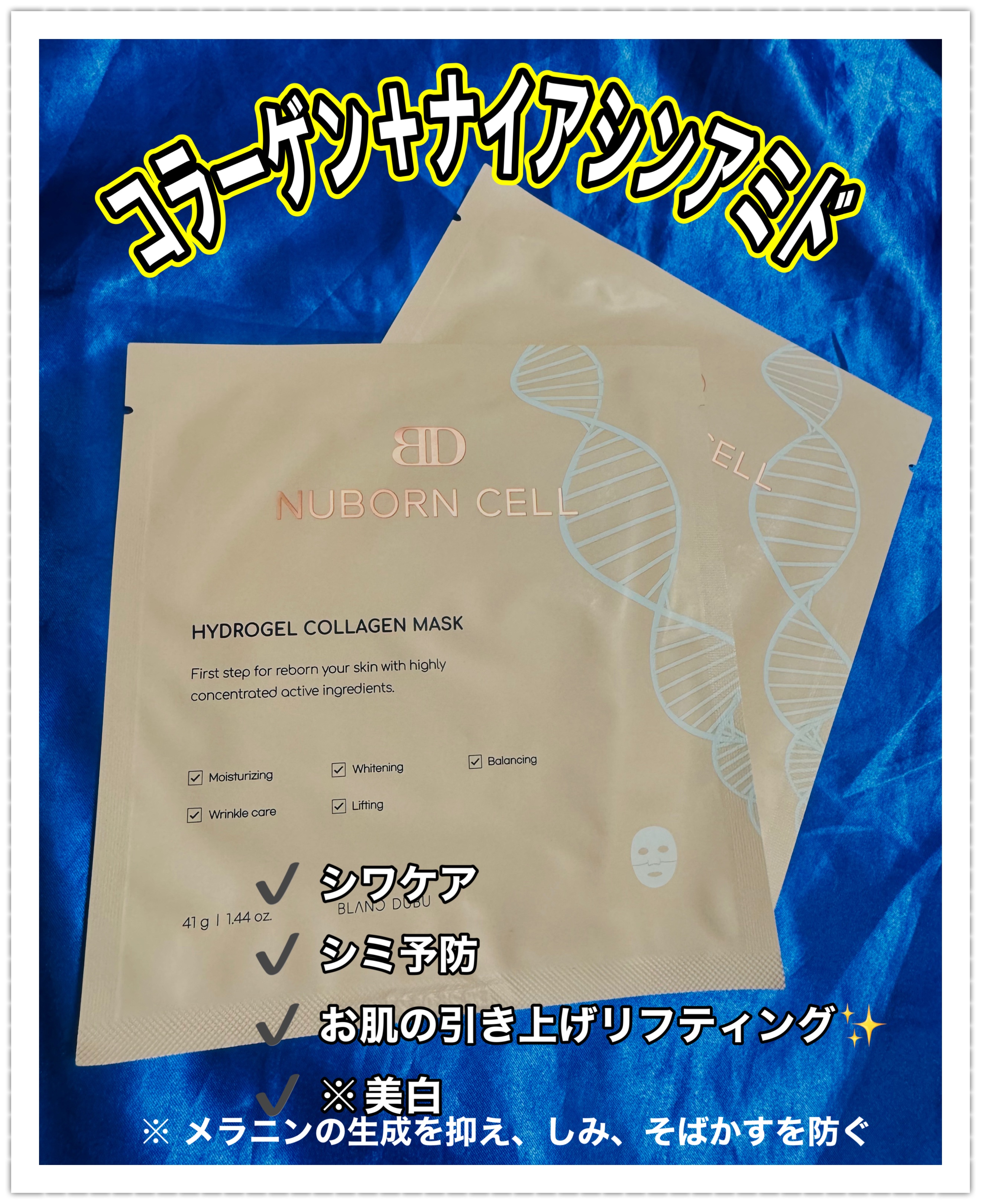 BLANCDUBU/NUBORNCELLHYDROGELCOLLAGENMASK貼っている間にコラーゲンを吸収して白⇒透明になるおもしろいパック6時間貼りっぱなしで、寝てしまっても大丈夫な便利なパック💤シートも丈夫なので破けません♪ほんのり良...
