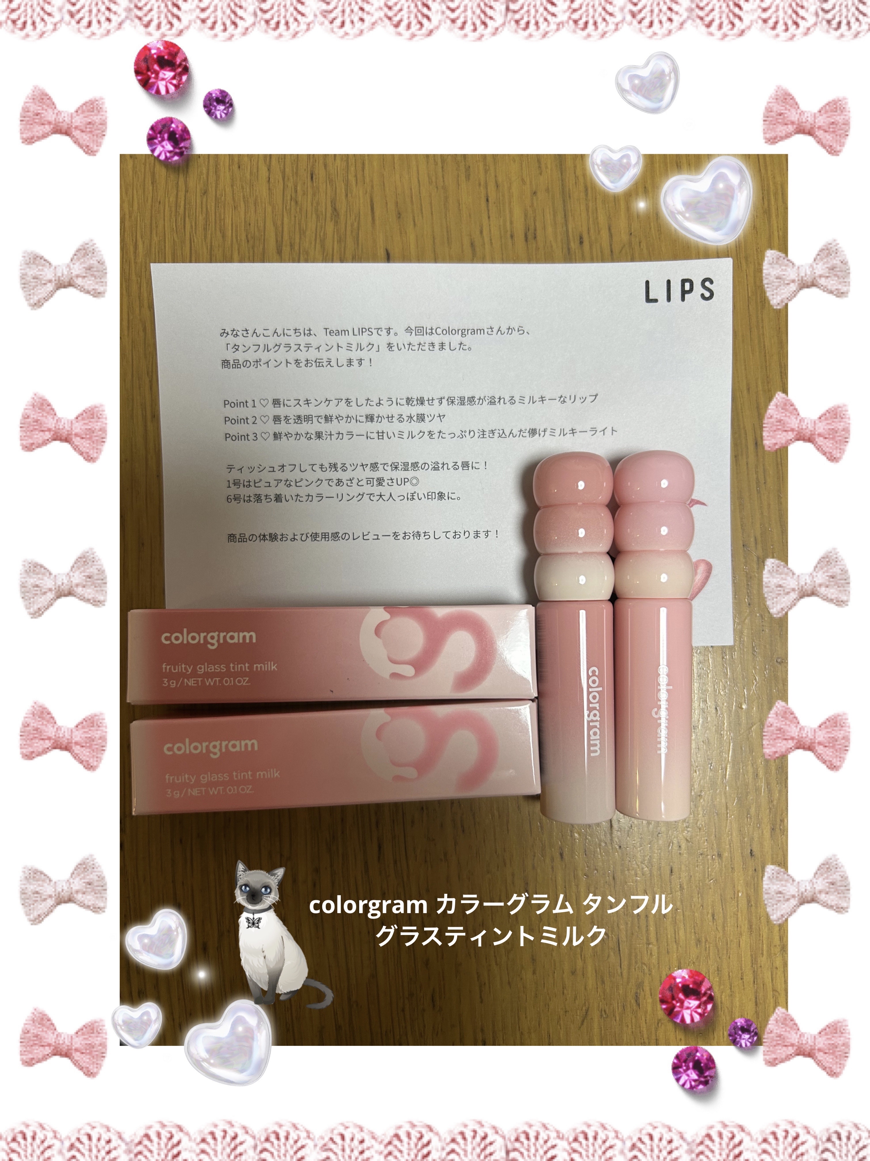 LIPS様を通して、colorgramさんから『タンフルグラスティントミルク』を頂きました!!潤いが続くミルキーティントリップです。20%以上の水分&オイルバリア配合で、ベタつき感のないみずみずしいテクスチャーでした💄✨ツヤ感のある仕上がりで...