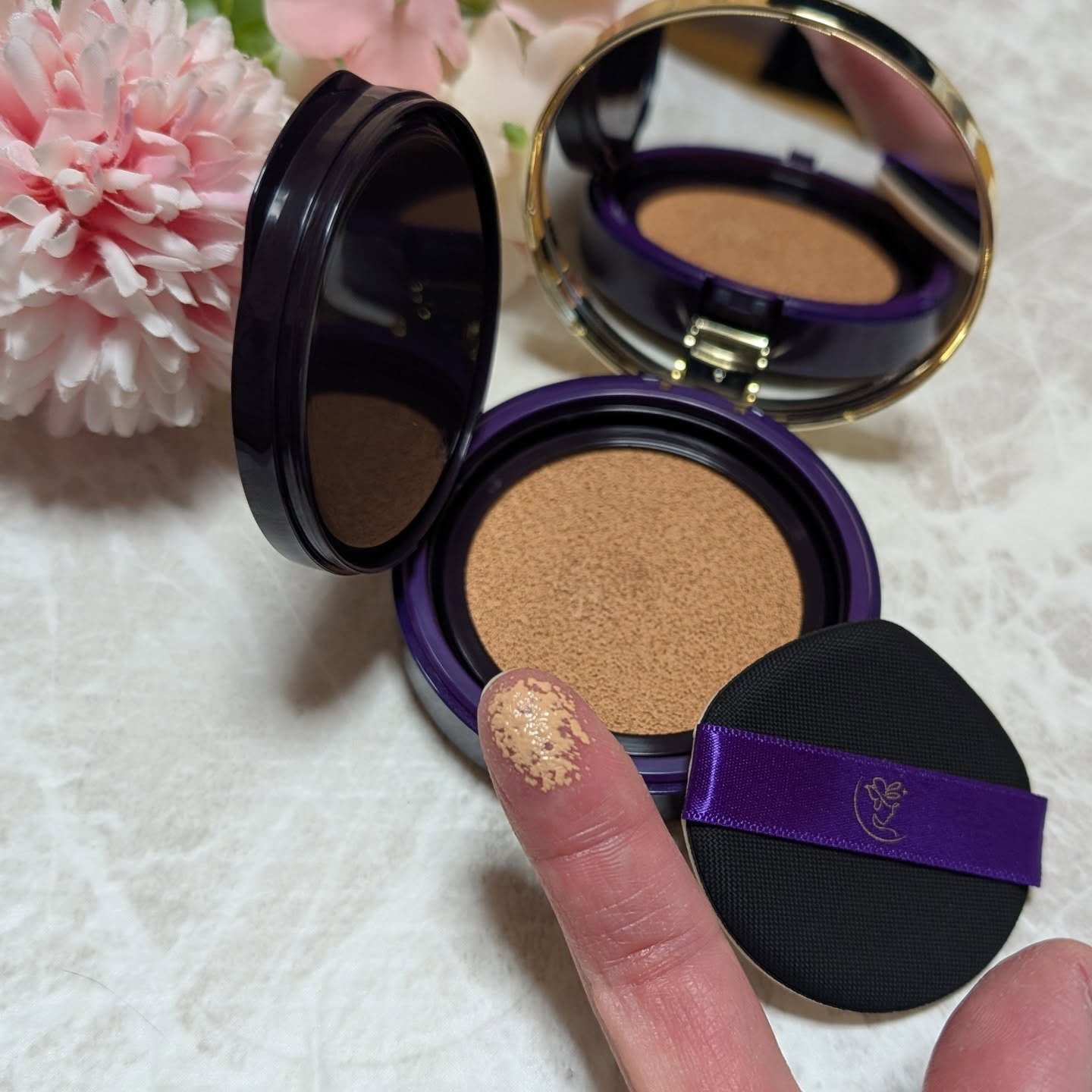 クッション部分はしっかりとファンデーションが染み込んでいて、触るとジュワッとするような感覚です。 ツヤ感のある綺麗な仕上がりで、カバー力もあるように思いますが厚塗り感がないのが嬉しいなと思います✨ 薄付きに仕上げられるのですが重ねても重たくならず、仕上がりがとにかく綺麗で肌への密着も良いように感じました。 付けていて肌への圧迫感も感じませんでしたし、使い心地も良くとても気に入りました😊