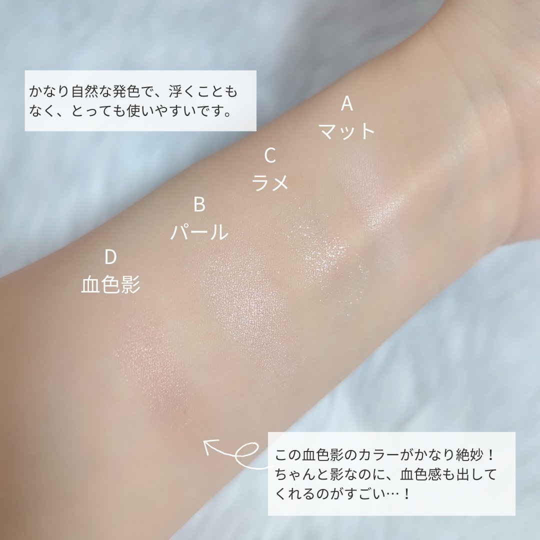 マット・パール・ラメ入りで3パターンの涙袋が作れます。 マットは透け感があり目元のシワが気になりにくく、パールは繊細で透明感のあるツヤっとした仕上がりに、ラメはキラキラと輝く透け発色です。 影用のカラーは血色影カラーなのですごく馴染みます! 盛り耐性ない方でも自然な涙袋が作れるからこのシリーズまじで神てす❣️
