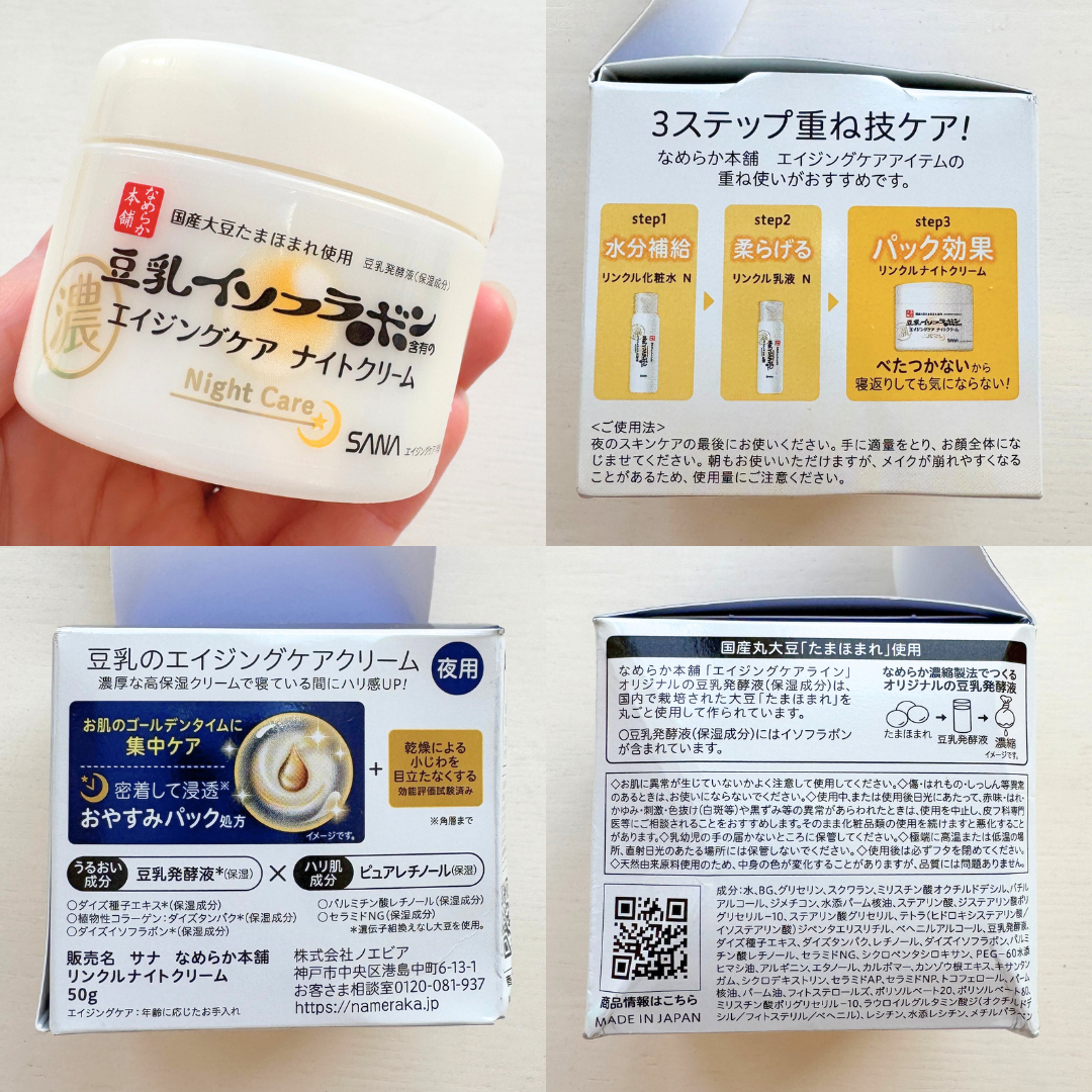 豆乳発酵液に加え3種のセラミド、レチノール誘導体などを配合し、角層のすみずみまで潤いで満たすナイトクリーム。 コクのあるテクスチャーでピタッと高密着。 贅沢なパックをしているようで気持ちよく使えます。 無香料、無着色、無鉱物油の低刺激処方。 低価格だから続けやすいところもお気に入りです。