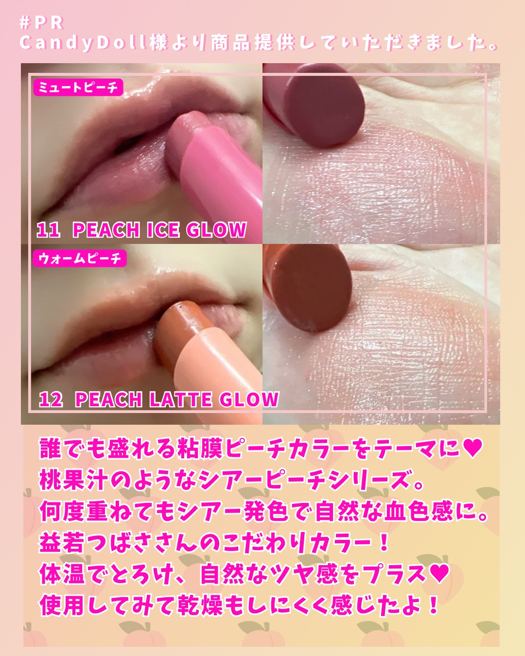 CandyDoll˚✦桃果汁たっぷりジューシー感シアーピーチシリーズ新登場🍑#モイスチャーリップスティック¥1,430[公式価格]テーマは誰でも盛れる粘膜ピーチカラー!彩度・発色・透け感のバランスを調節したお肌の透明感を引き立てるこだわりカラ...