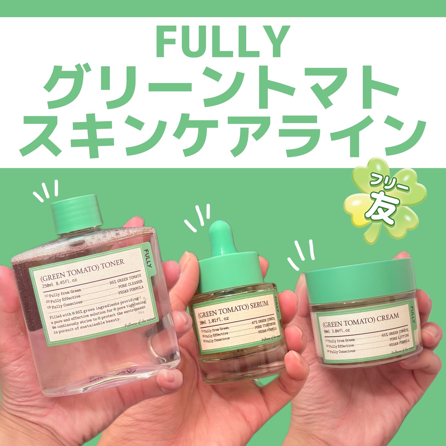 .FULLY▶︎グリーントマトトナー▶︎グリーントマトセラム▶︎グリーントマトクリームヴィーガンコスメブランド『FULLY』の商品は、製造加工のどの段階においても動物性原料が使用・添加されていないヴィーガン認証されている商品です!#PR【共通...