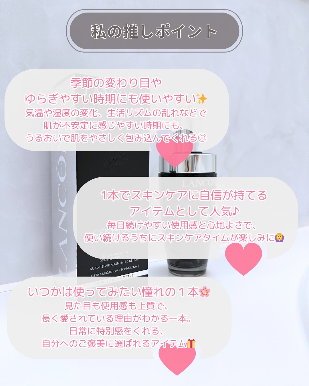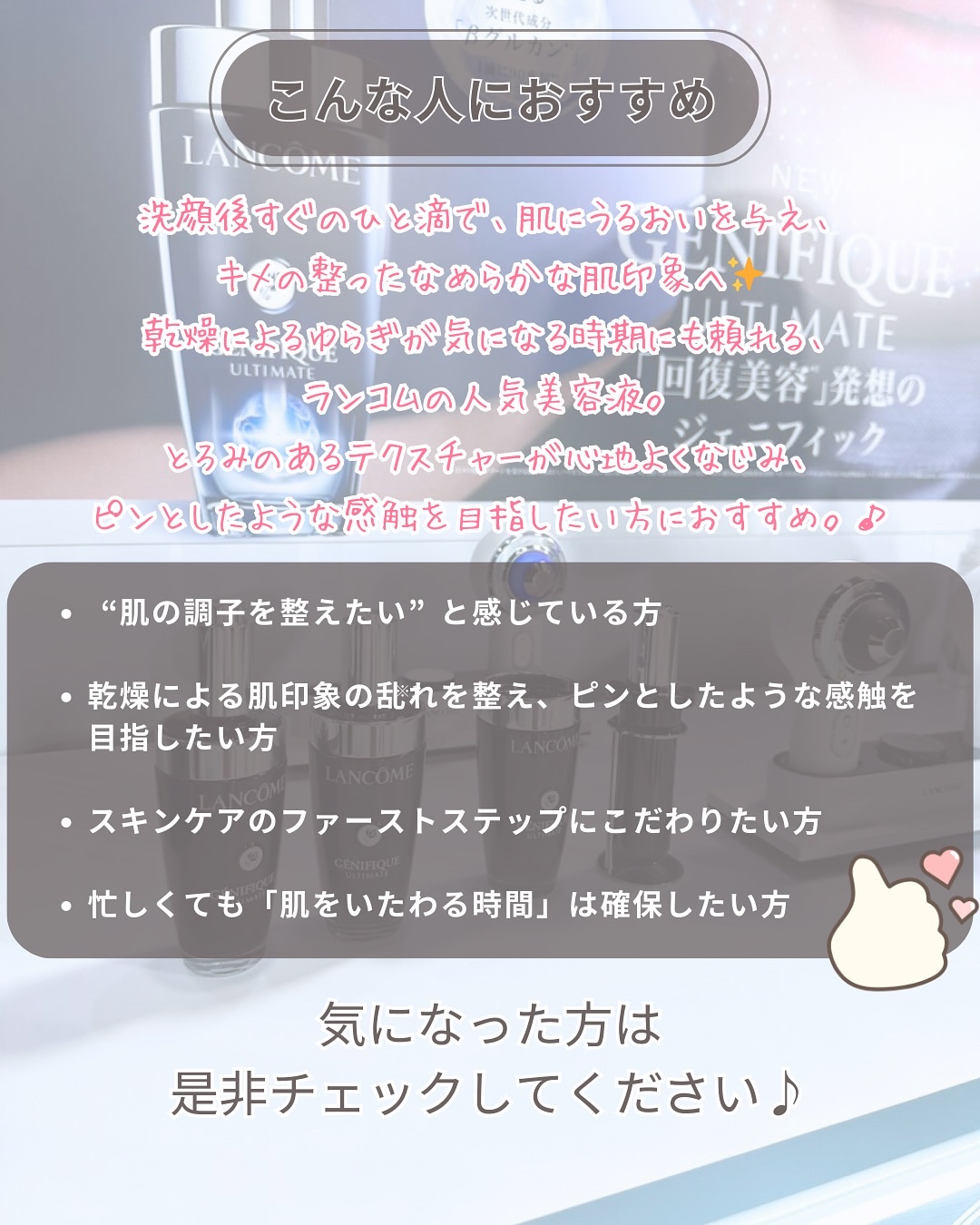 ˗ˋ𝐋𝐀𝐍𝐂𝐎𝐌𝐄美しさは、回復力からˊ˗昨年リニューアルして大きな進化を遂げた《ジェニフィックアルティメセラム》美の回復をスピードアップする次世代成分「βグルカン」を新たに配合!肌が受けたダメージを回復していくNrF2と呼ばれるたんぱく質(...