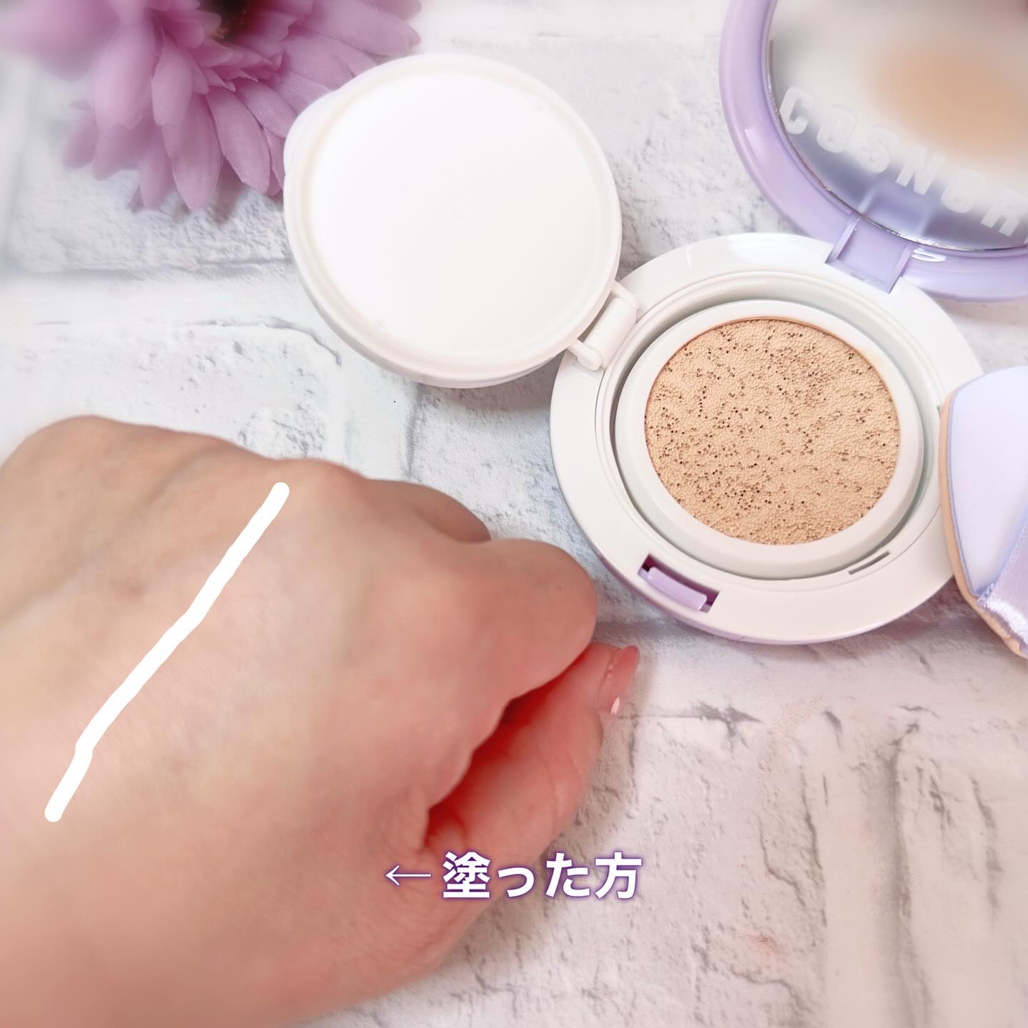 パンテノール 11,250ppm 配合のクッションファンデ💗 水分を引き寄せて保持する性質を持つパンテノールが鎮静保護・水分保湿・バリア強化✊🏻∿🤍⸝⸝⸝⸒ 水分たっぷりなテクスチャーがしっかり保湿してくれそう.ᐟ.ᐟ 軽い使用感でしっかり密着🥰ᩚ ツヤ感もあって乾燥肌さんにおすすめしたいファンデ💖 しずく型のパフが細かいところまで塗りやすかったよ⋆✦