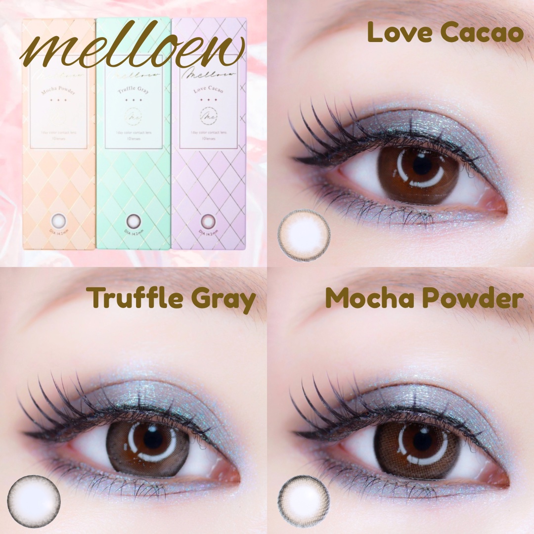 - ※2025年6月以降、商品パッケージ裏面・側面の一部表記を順次変更いたします。尚、これにかかる商品の交換・返品は承っておりません。 ふわっと漂う多幸感 キラキラとした瞳 そんな多くの人が憧れる印象はmelloewで作れる! 王道盛れからあざと盛れまでどんな盛れも叶うラインナップで瞳をコーディネート☆ Cotton Ring(コットンリング) DIA14.2㎜/着色直径13.5㎜ 溶け込みベージュ×くっきりフチ 写真でもリアルでも盛れちゃう♪ Silky Pearl(シルキーパール) DIA14.2㎜/着色直径13.5㎜ ツヤっぽベージュ×細フチ 垢抜けた印象にしたい方におすすめ♪ Truffle Gray(トリュフグレー) DIA14.2㎜/着色直径13.4㎜ おしゃれモテ♡ 濃いめグレージュ×ぼかし細フチ 品よく盛れるお嬢様な瞳に Pure Nude(ピュアヌード) DIA14.2㎜/着色直径13.2㎜ 絶妙ヌーディカラー×グラデフチ お仕事やカラコン初心者にもおすすめ♪ Brown Chou(ブラウンシュー) DIA14.2㎜/着色直径13.6㎜ まろやかブラウン×ぼかしフチ 日常使いにもおすすめ♪ Mocha Powder(モカパウダー) DIA14.2㎜/着色直径13.6㎜ リピ確モテ♡ ふわふわモカ×くりっとフチ 絶対盛れちゃう甘い瞳に Love Cacao(ラブカカオ) DIA14.2㎜/着色直径13.0㎜ 清楚モテ♡ とろふわチョコレート×こっそりフチ バレずに盛れちゃう瞳に カラーコンタクトレンズの不適正使用による眼障害の危険性等などがあります。 ●コンタクトレンズは高度管理医療機器です。不十分な洗浄・消毒など不適切なケアや、長時間・交換期間を超えた装用により、アレルギー性結膜炎、角膜感染症、角膜潰瘍等の重篤な眼障害が発生する危険性があります ●ご使用前に取扱説明書を確認してください 使用上の留意事項 ●眼科医院等を受診してからお求めください ●眼に異常を感じたら直ちにレンズ使用を中止し、お近くの眼科等で診察を受けてください ●医師の指示にしたがってご使用ください ●コンタクトレンズを装用する場合、自覚症状がなくても、眼科医院等での定期検査を受けてください ●レンズに不具合がある場合は使用しないでください