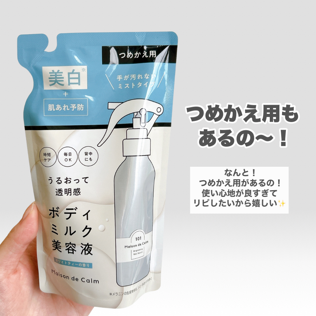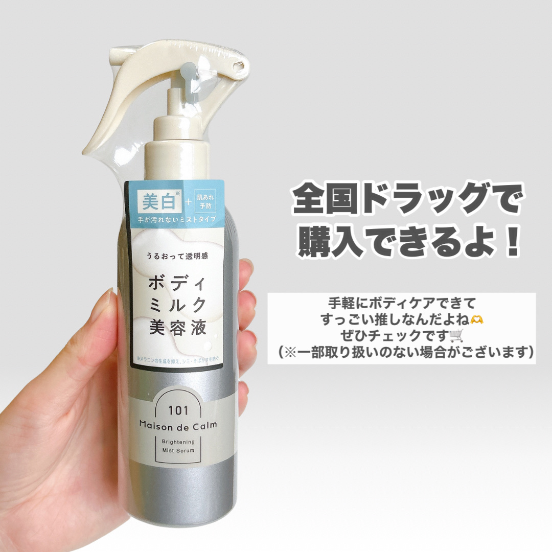 ミストタイプのボディ用美白美容液。しっとりなめらかな使い心地と心安らぐホワイトティーの香りがお気に入り✨ 逆さにしても使えるから背中までケア♪ 是非チェックしてみてね💕 メゾン ド カーム ブライトニング ミストセラム <販売名:薬用美容液W7 a>【医薬部外品】
