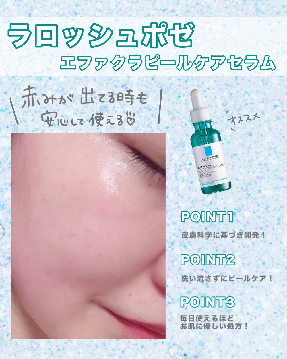 - 肌トラブル*1にうるおい*2角質ケア ざら肌からつる肌、毛穴レス印象肌*3へ ①触って感じるその「ざらつき」は 古い角質=肌トラブル*1の原因かも? ②敏感肌にも使いやすい*4、毎日のうるおい角質ケア サリチル酸*5・ナイアシンアミド*6が両方とも配合 ③角質*7から、ニキビ*8までケア エファクラは洗顔~保湿までシリーズをご用意してます! *1 古い角質が招くざらつき感のこと *2 うるおい感まで *3 うるおい感を与え、なめらかな肌に導く *4 すべての人に肌トラブルがおきないわけではありません *5 角質柔軟成分 *6 整肌成分 *7 エファクラ ピールケア セラム *8 ニキビを防ぐ ラ ロッシュ ポゼ エファクラ フォーミング クレンザー、ラ ロッシュ ポゼ エファクラ モイスチャー バランス ローション[医薬部外品]