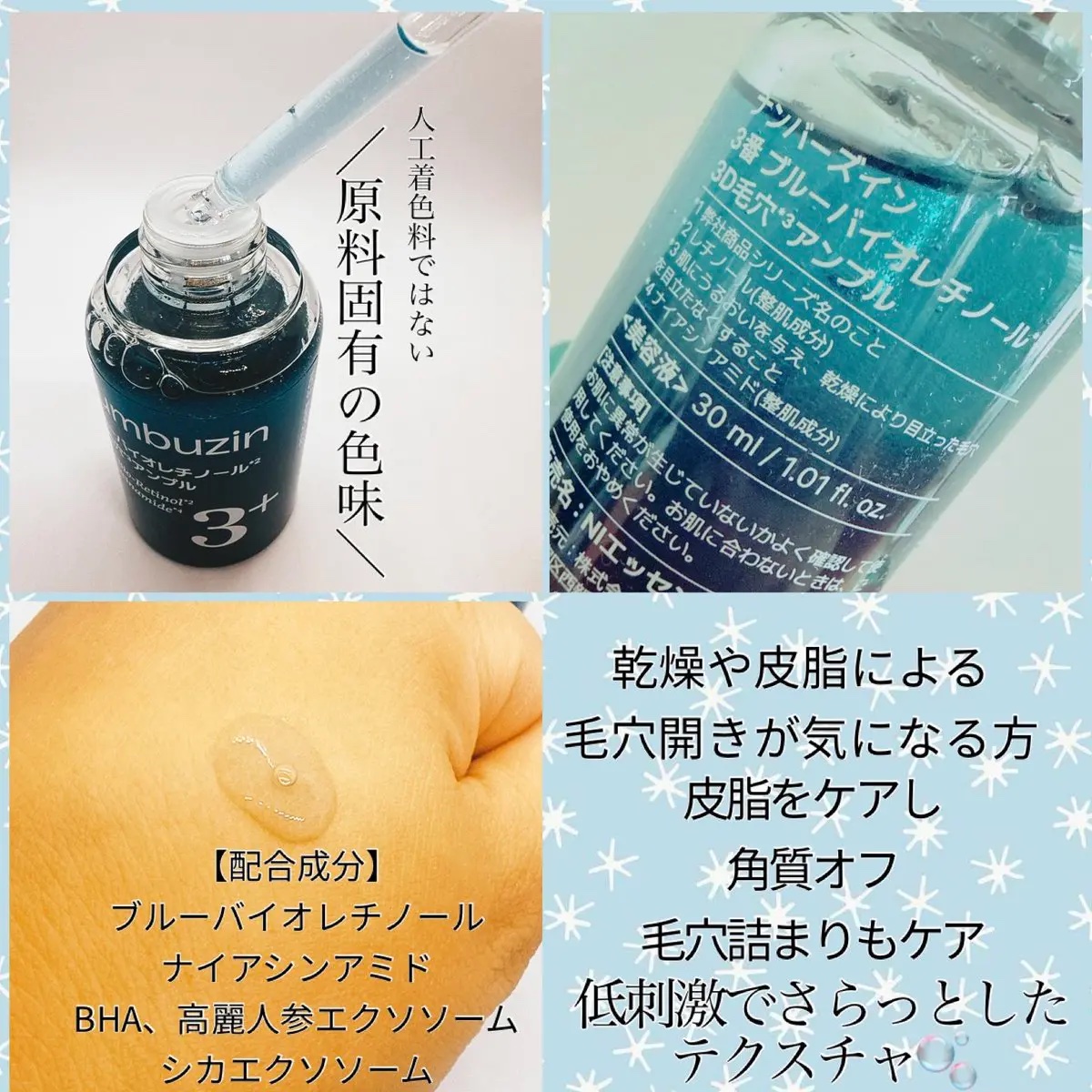 - <3番 ブルーバイオレチノール3D毛穴アンプル> 水、ナイアシンアミド、BG、プロパンジオール、グリセリン、DPG、ペンチレングリコール、グリセリルグルコシド、1,2-ヘキサンジオール、トリ(カプリル酸/カプリン酸)グリセリル、グリセレス-26、(C12-14)アルケス-12、ポリソルベート20、塩化Ca、サリチル酸、加水分解コラーゲン、ジェランガム、ホノキオール、パンテノール、PPG-13デシルテトラデセス-24、加水分解スクレロチウムガム、クロレラエキス、クエン酸Na、ツボクサエキス、グルコース、クチナシエキス、アデノシン、アラビアゴム、クエン酸、オタネニンジン不定根細胞外小胞、デキストリン、レシチン、フナバラソウエキス、シリカ、ツボクサカルス細胞外小胞、エチルヘキシルグリセリン、マカデミア種子油、レチノール、水添レシチン、タチアオイ花エキス、アブラナステロールズ、グリシン、コレステロール、ラウリン酸ポリグリセリル-10、ラウロイルグルタミン酸ジ(オクチルドデシル/フィトステリル/ベヘニル)、酢酸トコフェロール、ステアリン酸水酸化(Al/Mg)、テトラ(ジ-t-ブチルヒドロキシヒドロケイヒ酸)ペンタエリスリチル、セチルリン酸K、ダイズ油、マロン酸ジエチルヘキシルシリンギリデン、トコフェロール、クエン酸トリス(テトラメチルヒドロキシピペリジノール)、トリペプチド-1銅、ヒドロキシエチルセルロース、メリアアザジラクタ花エキス、コクシニアインディカ果実エキス、メリアアザジラクタ葉エキス、アロエベラ花エキス、ナス果実エキス、カミメボウキ葉エキス、サンゴモエキス、ウコン根エキス