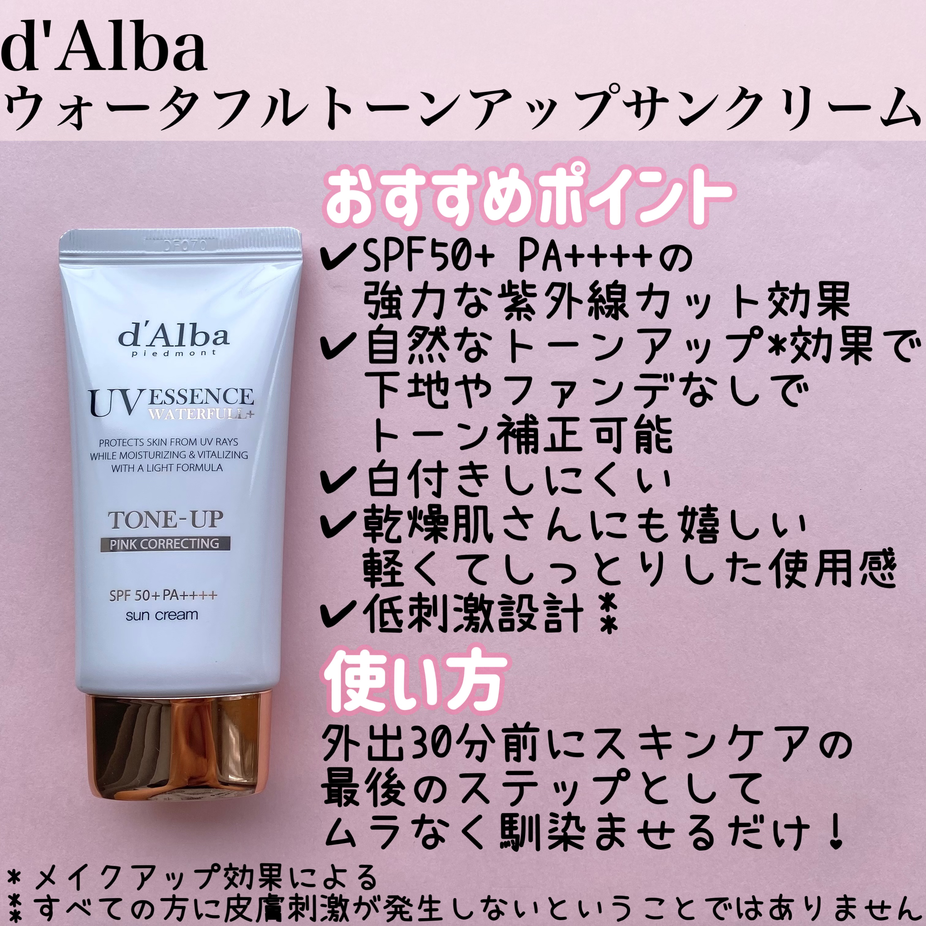 つやんとした肌に仕上がる下地🌿SPFも高いので、日焼け止め効果もバッチリ🌞ダルバ🌿ウォータフルトーンアップサンクリーム香りも好き🩷SPF50+・PA++++日焼けによるしみ、そばかすを防ぎ水のようななめらかな使用感で肌色をより明るくする化粧下...