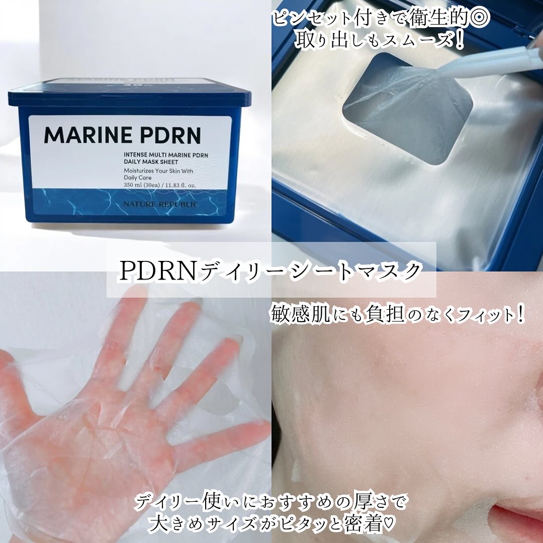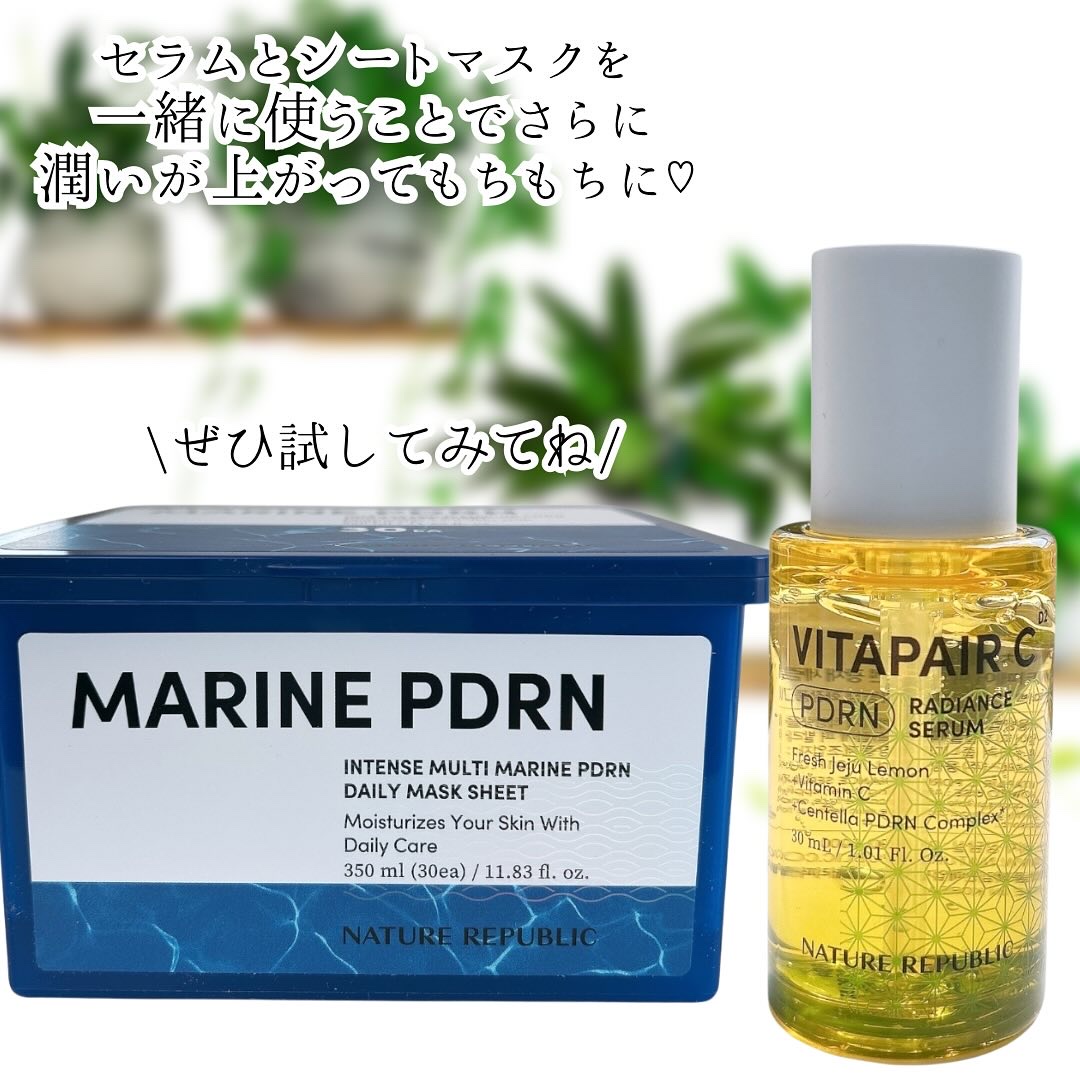 ネイチャーリパブリックPDRNデイリーシートマスク MARINEPDRN前回投稿したビタペアCPDRN水潤セラムはこのデイリーシートマスクを一緒に使用すること効果的なんだって♡エッセンスたっぷりでひったひた!うすいマスクだけどみずみずしくてひ...