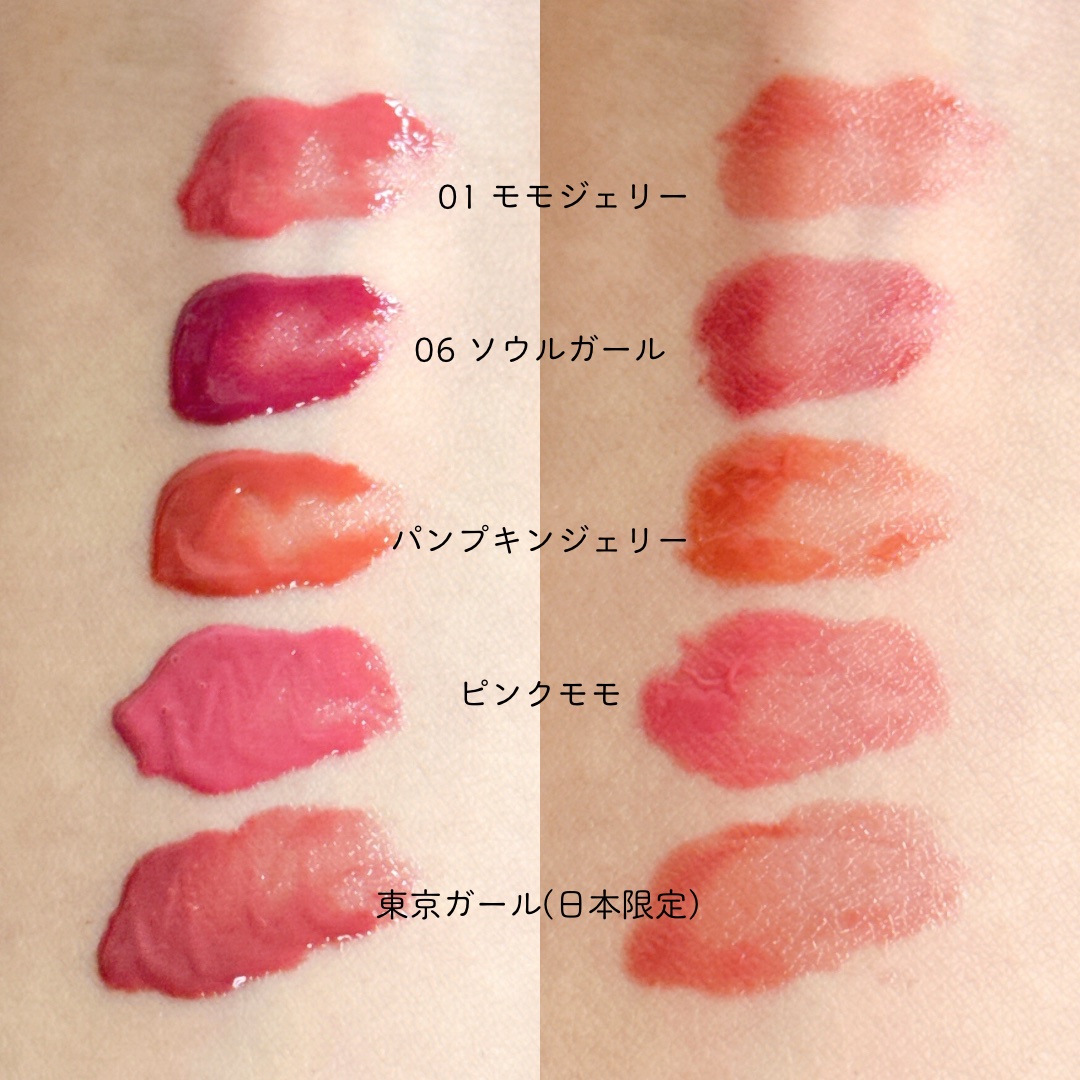 - <01 モモジェリー> Water、Diphenyl Dimethicone、Diisostearyl Malate、Bis-Diglyceryl Polyacyladipate-2、Hydrogenated Polyisobutene、Bis-Behenyl/Isostearyl/Phytosteryl Dimer Dilinoleyl Dimer Dilinoleate、Cetyl PEG/PPG-10/1 Dimethicone、Diglycerin、Hydrogenated Polydecene、Dipropylene Glycol、Polysorbate 60、Sorbitan Isostearate、Hydroxyethyl Acrylate/Sodium Acryloyldimethyl Taurate Copolymer、Pentylene Glycol、Squalane、Titanium Dioxide (CI 77891)、Ethylene/Propylene Copolymer、Ceteareth-20、Phenoxyethanol、Polyglycerin-3、Yellow 5 (CI 19140)、Red 33 (CI 17200)、Fragrance、Ethylhexylglycerin、Glycerin、Aluminum Hydroxide、Ammonium Polyacrylate、Yellow 6 (CI 15985)、Butylene Glycol、Blue 1 (CI 42090)、Tocopheryl Acetate、Prunus Persica (Peach) Fruit Extract、1,2-Hexanediol、Sodium Hyaluronate、Hydroxypropyltrimonium Hyaluronate、Sodium Acetylated Hyaluronate、Hydrolyzed Hyaluronic acid、Hyaluronic Acid、Sodium Hyaluronate Crosspolymer、Hydrolyzed Sodium Hyaluronate、Potassium Hyaluronate <02 ヘルシーサーモン> Water、Diphenyl Dimethicone、Diisostearyl Malate、Bis-Diglyceryl Polyacyladipate-2、Hydrogenated Polyisobutene、Bis-Behenyl/Isostearyl/Phytosteryl Dimer Dilinoleyl Dimer Dilinoleate、Cetyl PEG/PPG-10/1 Dimethicone、Diglycerin、Hydrogenated Polydecene、Dipropylene Glycol、Polysorbate 60、Sorbitan Isostearate、Hydroxyethyl Acrylate/Sodium Acryloyldimethyl Taurate Copolymer、Pentylene Glycol、Squalane、Ethylene/Propylene Copolymer、Ceteareth-20、Phenoxyethanol、Titanium Dioxide (CI 77891)、Polyglycerin-3、Yellow 6 (CI 15985)、Fragrance、Ethylhexylglycerin、Red 33 (CI 17200)、Glycerin、Red 28 (CI 45410)、Aluminum Hydroxide、Ammonium Polyacrylate、Yellow 5 (CI 19140)、Butylene Glycol、Tocopheryl Acetate、Blue 1 (CI 42090)、Prunus Persica (Peach) Fruit Extract、1,2-Hexanediol、Sodium Hyaluronate、Hydroxypropyltrimonium Hyaluronate、Sodium Acetylated Hyaluronate、Hydrolyzed Hyaluronic acid、Hyaluronic Acid、Sodium Hyaluronate Crosspolymer、Hydrolyzed Sodium Hyaluronate、Potassium Hyaluronate <03 ヌーディーピンク> Water、Diphenyl Dimethicone、Diisostearyl Malate、Bis-Diglyceryl Polyacyladipate-2、Hydrogenated Polyisobutene、Bis-Behenyl/Isostearyl/Phytosteryl Dimer Dilinoleyl Dimer Dilinoleate、Cetyl PEG/PPG-10/1 Dimethicone、Diglycerin、Hydrogenated Polydecene、Dipropylene Glycol、Polysorbate 60、Sorbitan Isostearate、Hydroxyethyl Acrylate/Sodium Acryloyldimethyl Taurate Copolymer、Pentylene Glycol、Squalane、Ethylene/Propylene Copolymer、Ceteareth-20、Titanium Dioxide (CI 77891)、Phenoxyethanol、Polyglycerin-3、Red 33 (CI 17200)、Yellow 5 (CI 19140)、Fragrance、Ethylhexylglycerin、Glycerin、Aluminum Hydroxide、Ammonium Polyacrylate、Butylene Glycol、Blue 1 (CI 42090)、Tocopheryl Acetate、Prunus Persica (Peach) Fruit Extract、1,2-Hexanediol、Sodium Hyaluronate、Hydroxypropyltrimonium Hyaluronate、Sodium Acetylated Hyaluronate、Hydrolyzed Hyaluronic acid、Hyaluronic Acid、Sodium Hyaluronate Crosspolymer、Hydrolyzed Sodium Hyaluronate、Potassium Hyaluronate <04 ローズミルク> Water、Diphenyl Dimethicone、Diisostearyl Malate、Bis-Diglyceryl Polyacyladipate-2、Hydrogenated Polyisobutene、Bis-Behenyl/Isostearyl/Phytosteryl Dimer Dilinoleyl Dimer Dilinoleate、Cetyl PEG/PPG-10/1 Dimethicone、Diglycerin、Hydrogenated Polydecene、Dipropylene Glycol、Polysorbate 60、Sorbitan Isostearate、Hydroxyethyl Acrylate/Sodium Acryloyldimethyl Taurate Copolymer、Pentylene Glycol、Squalane、Ethylene/Propylene Copolymer、Ceteareth-20、Titanium Dioxide (CI 77891)、Phenoxyethanol、Polyglycerin-3、Red 28 (CI 45410)、Yellow 6 (CI 15985)、Fragrance、Ethylhexylglycerin、Red 33 (CI 17200)、Glycerin、Aluminum Hydroxide、Ammonium Polyacrylate、Butylene Glycol、Blue 1 (CI 42090)、Tocopheryl Acetate、Prunus Persica (Peach) Fruit Extract、1,2-Hexanediol、Sodium Hyaluronate、Hydroxypropyltrimonium Hyaluronate、Sodium Acetylated Hyaluronate、Hydrolyzed Hyaluronic acid、Hyaluronic Acid、Sodium Hyaluronate Crosspolymer、Hydrolyzed Sodium Hyaluronate、Potassium Hyaluronate <05 ベージュフィグ> Water、Diphenyl Dimethicone、Diisostearyl Malate、Bis-Diglyceryl Polyacyladipate-2、Hydrogenated Polyisobutene、Bis-Behenyl/Isostearyl/Phytosteryl Dimer Dilinoleyl Dimer Dilinoleate、Cetyl PEG/PPG-10/1 Dimethicone、Diglycerin、Hydrogenated Polydecene、Dipropylene Glycol、Polysorbate 60、Sorbitan Isostearate、Hydroxyethyl Acrylate/Sodium Acryloyldimethyl Taurate Copolymer、Pentylene Glycol、Squalane、Titanium Dioxide (CI 77891)、Ethylene/Propylene Copolymer、Ceteareth-20、Phenoxyethanol、Polyglycerin-3、Yellow 5 (CI 19140)、Red 33 (CI 17200)、Fragrance、Ethylhexylglycerin、Yellow 6 (CI 15985)、Glycerin、Aluminum Hydroxide、Ammonium Polyacrylate、Butylene Glycol、Blue 1 (CI 42090)、Tocopheryl Acetate、Prunus Persica (Peach) Fruit Extract、1,2-Hexanediol、Sodium Hyaluronate、Hydroxypropyltrimonium Hyaluronate、Sodium Acetylated Hyaluronate、Hydrolyzed Hyaluronic acid、Hyaluronic Acid、Sodium Hyaluronate Crosspolymer、Hydrolyzed Sodium Hyaluronate、Potassium Hyaluronate <06 ソウルガール> Water、Diphenyl Dimethicone、Diisostearyl Malate、Bis-Diglyceryl Polyacyladipate-2、Hydrogenated Polyisobutene、Bis-Behenyl/Isostearyl/Phytosteryl Dimer Dilinoleyl Dimer Dilinoleate、Cetyl PEG/PPG-10/1 Dimethicone、Diglycerin、Hydrogenated Polydecene、Dipropylene Glycol、Polysorbate 60、Sorbitan Isostearate、Hydroxyethyl Acrylate/Sodium Acryloyldimethyl Taurate Copolymer、Pentylene Glycol、Squalane、Ethylene/Propylene Copolymer、Ceteareth-20、Titanium Dioxide (CI 77891)、Phenoxyethanol、Polyglycerin-3、Red 33 (CI 17200)、Yellow 6 (CI 15985)、Fragrance、Ethylhexylglycerin、Yellow 5 (CI 19140)、Glycerin、Aluminum Hydroxide、Ammonium Polyacrylate、Blue 1 (CI 42090)、Butylene Glycol、Tocopheryl Acetate