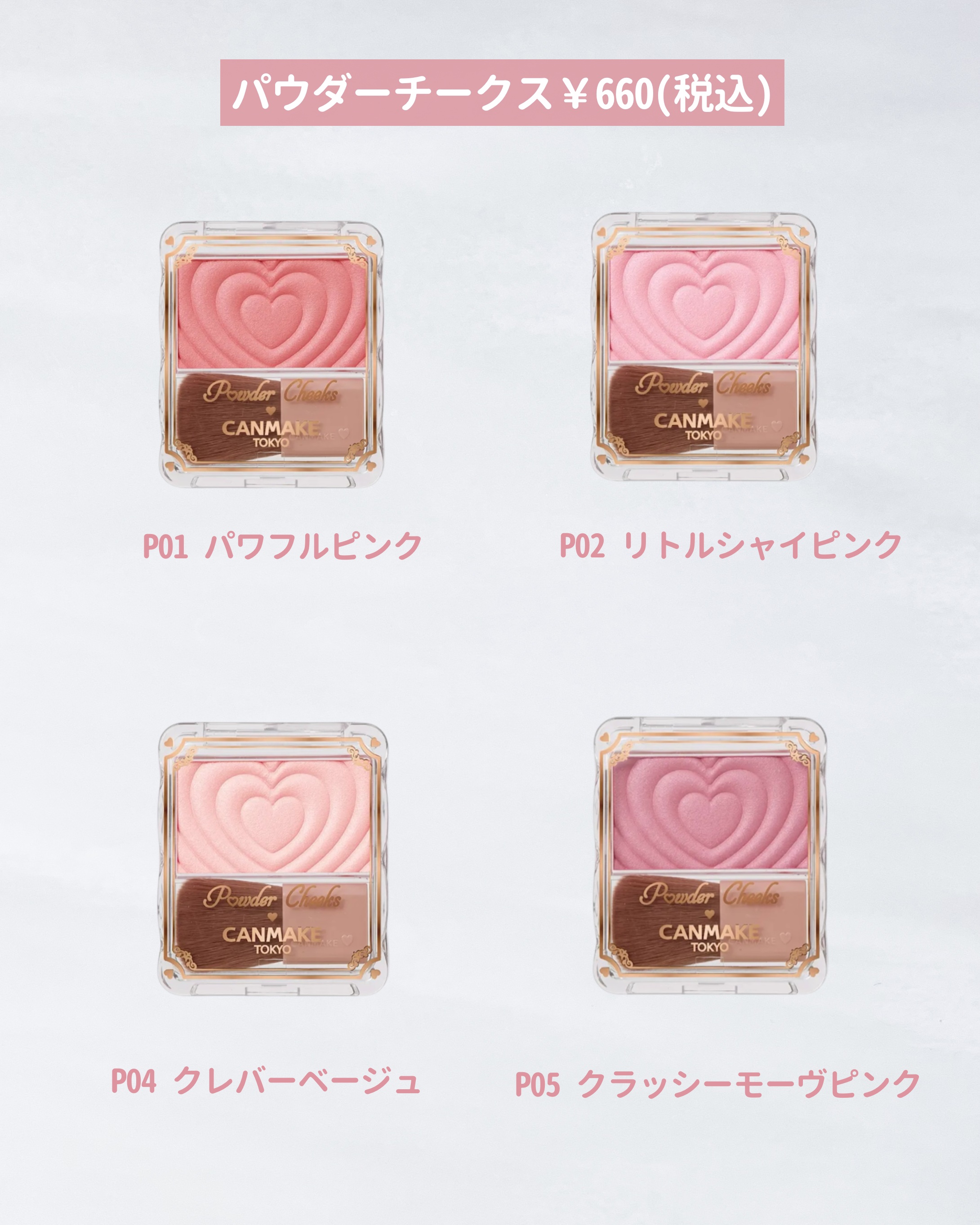 【キャンメイク】パウダーチークス 各¥660P01パワフルピンクP02リトルシャイピンクP03チアフルピーチP04クレバーベージュP05クラッシーモーヴピンクP06ジューシーコーラルしっとりとしたツヤ感がめちゃくちゃ可愛いチーク💗使用感が良く...