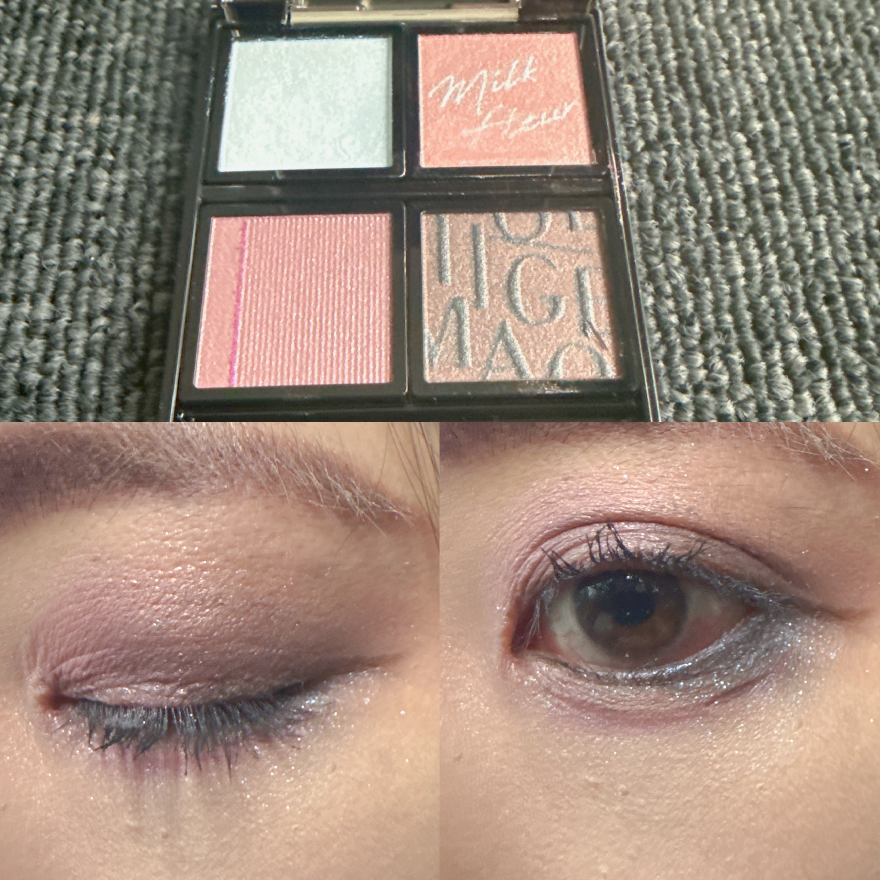 セザンヌの新色アイシャドウ02 シェリーピンクです🍀 01のコットンベージュは持ってて、その時に02のシェリーピンクを見てほしいいいいって思ってたんだけど、 特に私は目尻に白目を大きく見せるために白シャドウを置くので、濃いと浮いてしまうのですが浮くことなく、綺麗にぼかせました🙆♀️🩵 このアイシャドウも一軍入りです😍💭