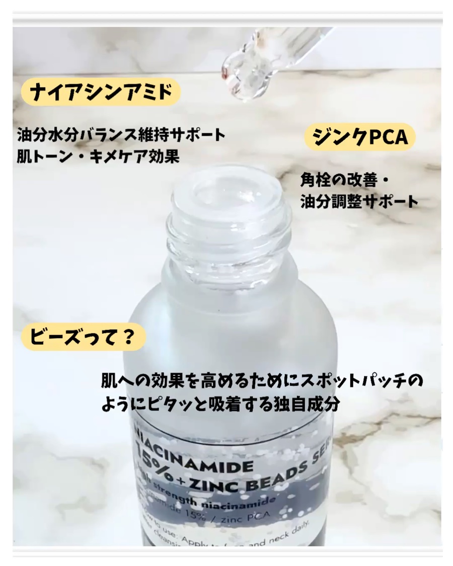 - ナイアシンアミド15%*1とビーズ化ジンクPCA*1配合。 肌の水分・油分のバランスを補い保ち、毛穴の目立ちにくい肌へ*2。 *1整肌成分 *2うるおいを与え毛穴の目立ちにくいなめらかな肌へ。