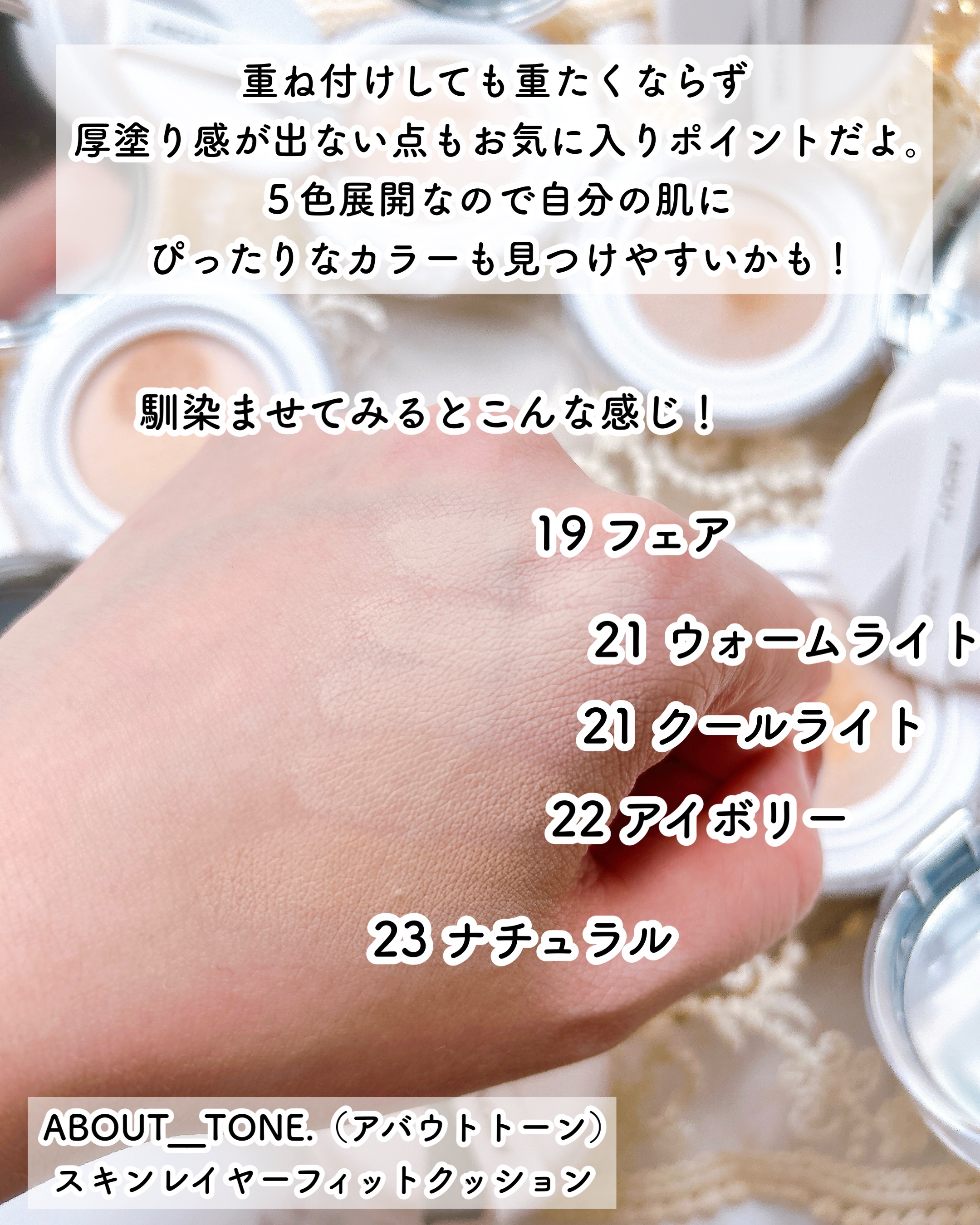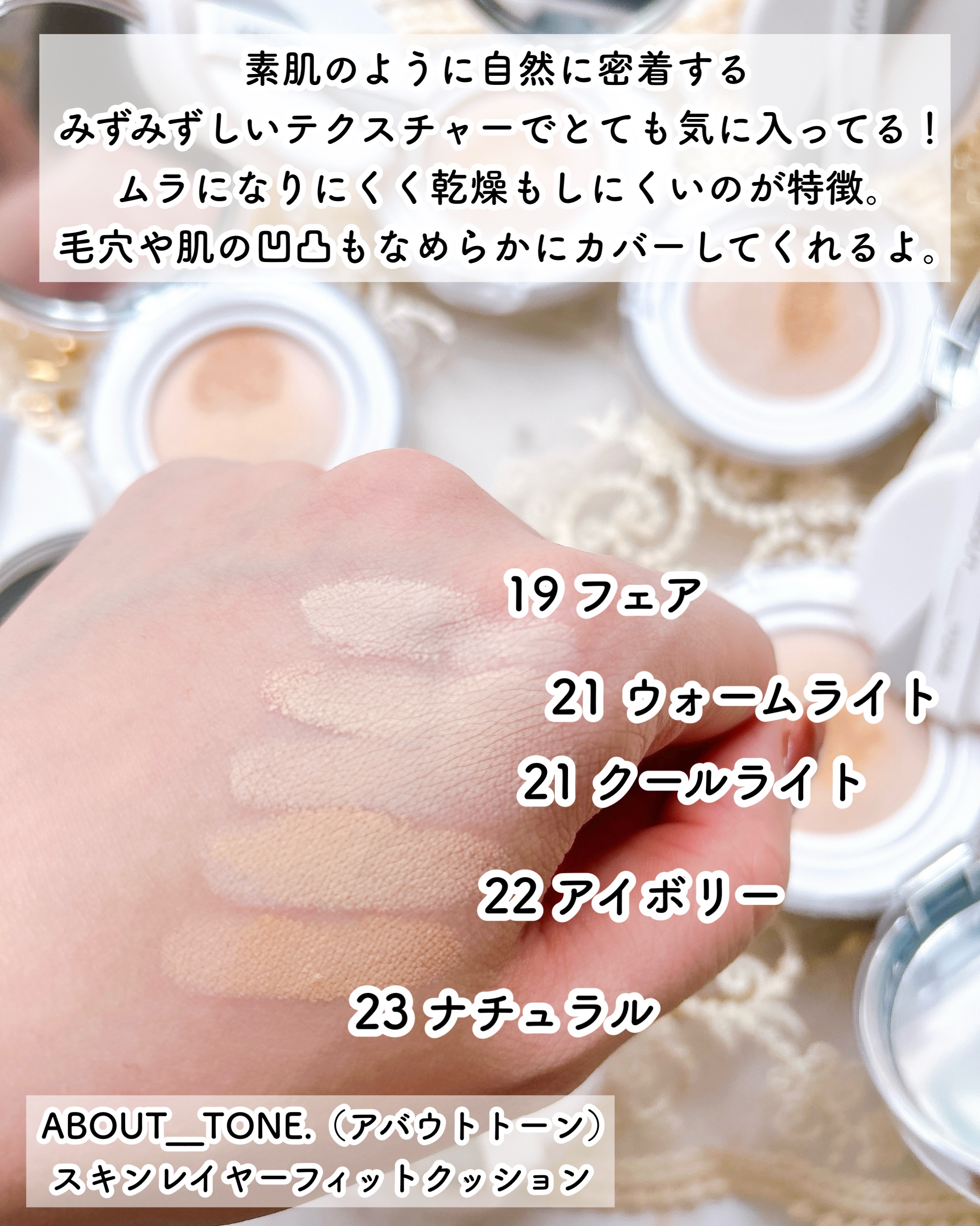 ABOUTTONEの新色使ってみた🤍スキンレイヤーフィットファンデーションスキンレイヤーフィットクッションまるで素肌のようにピタッと密着✨密着カバーファンデーション&ビジュ維持クッションから新色が登場‼️21.5Cクールベージュ21.5Wウォ...