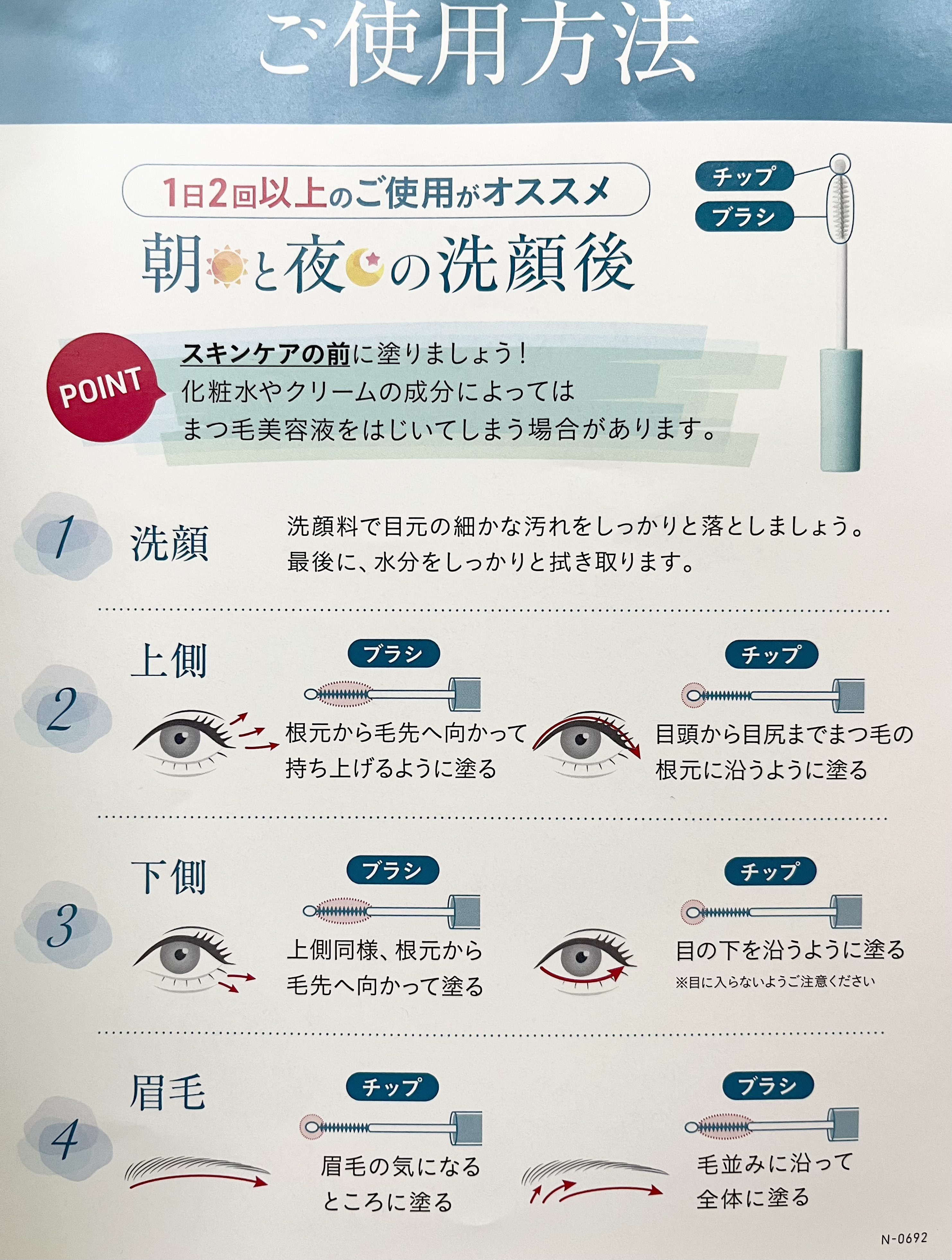 - <アイラッシュセラム> 水、BG、グリセリン、ヒト脂肪細胞順化培養液エキス、アセチルテトラペプチド-3、アカツメクサ花エキス、水溶性ケラチン(羊毛)、加水分解ケラチン(羊毛)、フムスエキス、ヘマチン、ビオチノイルトリペプチド-1、セイヨウアカマツ球果エキス、チャ葉エキス、加水分解コラーゲン、コンフリー葉エキス、ビワ葉エキス、カミツレ花エキス、パンテノール、オリーブ果実油、(クエン酸/乳酸/リノール酸/オレイン酸)グリセリル、ペンチレングリコール、1,2-ヘキサンジオール、カプリリルグリコール、グリシン、ピロ亜硫酸Na、塩化亜鉛、ポリソルベート60、デキストラン、トロポロン、(アクリレーツ/アクリル酸アルキル(C10-30))クロスポリマー、水酸化K、メチルパラベン、フェノキシエタノール