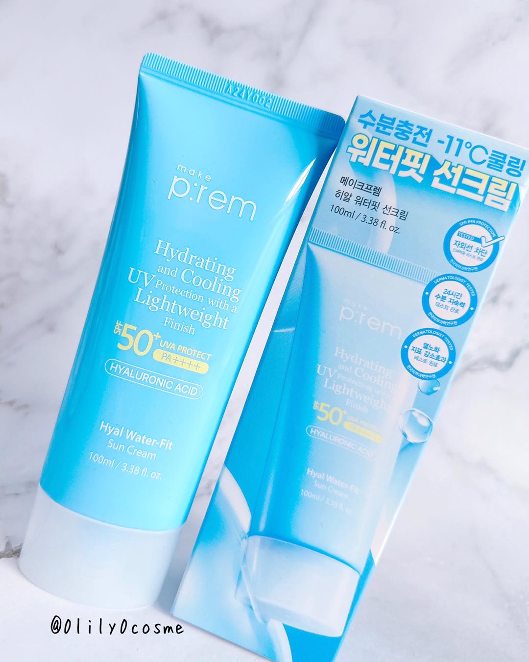 メイクプレム(@makeprem_jp)の新作のヒアルウォーターフィットサンクリーム🩵水分エッセンス80%配合で水分チャージまでしてくれる日焼け止め。ベタつかずなめらかな使用感で、日焼け止め特有のきしみを感じなかったよ☺️ツヤのある仕上がりも...