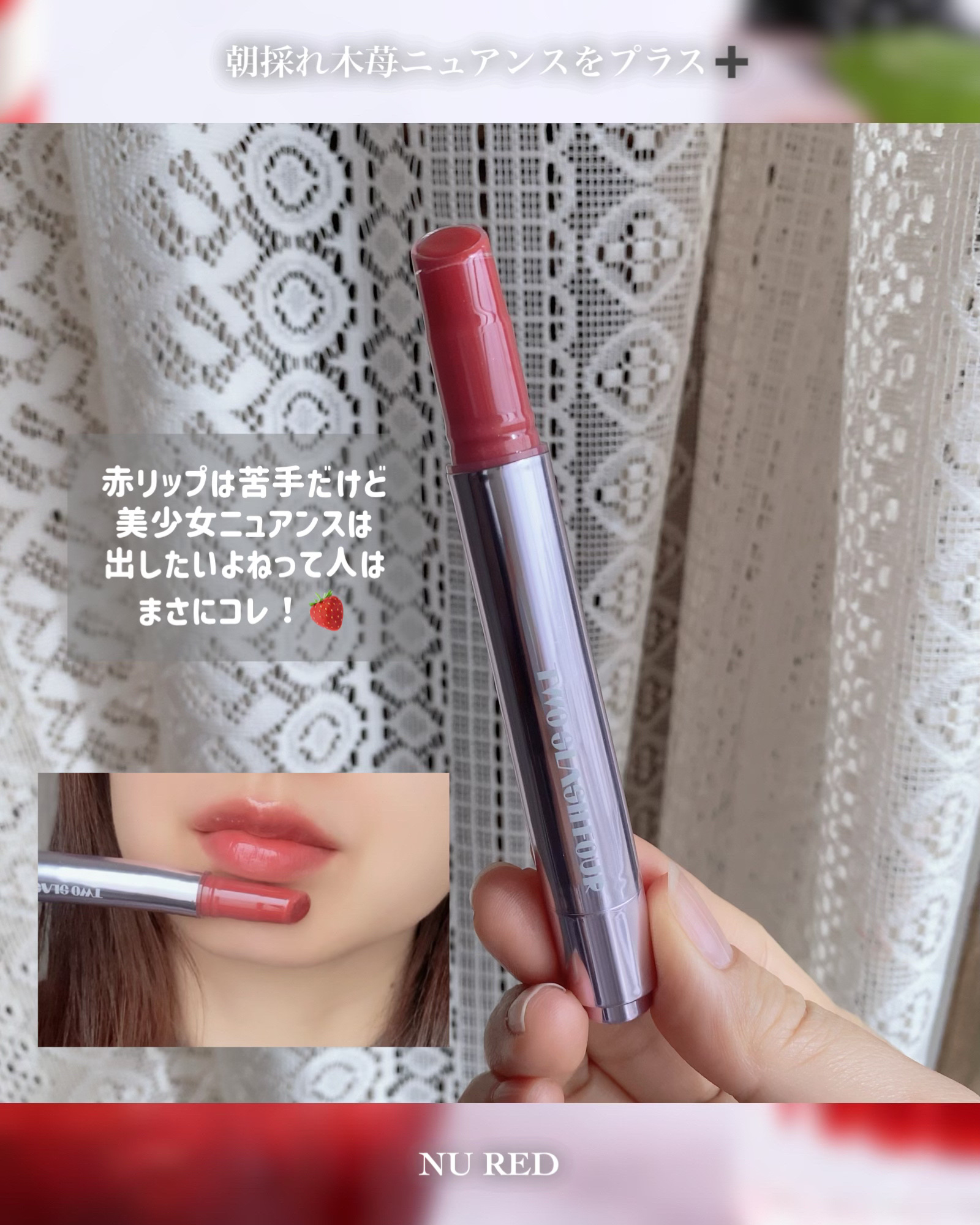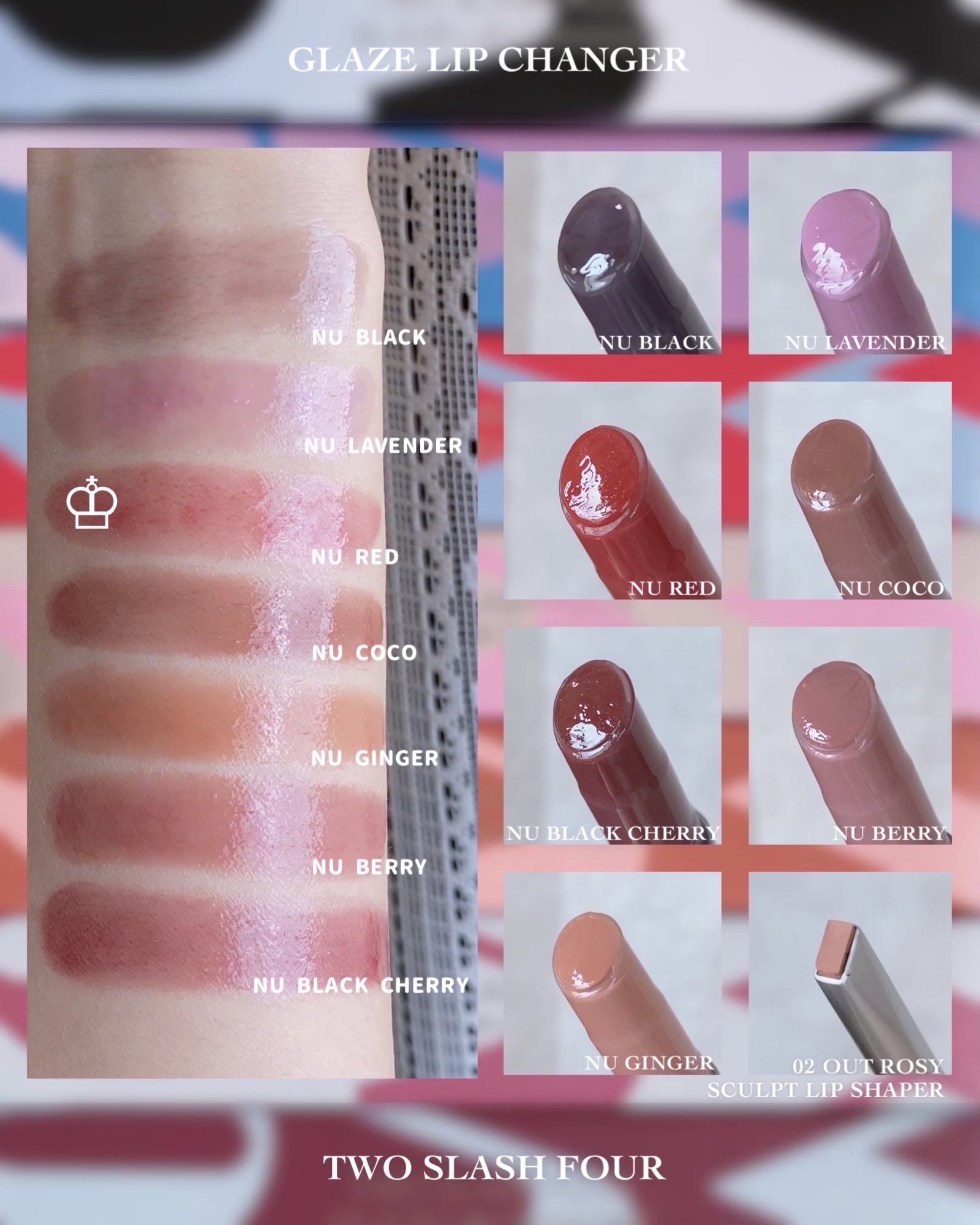 TWOSLASHFOURGlazeLipChangerトゥースラッシュフォーグレイズリップチェンジャー✔︎NUREDレトロなレッドカラーに鮮やかなゴールドパールをミックス✨✔︎NUBLACKCHERRY派手さを抑えたダークトーンカラーにほのか...